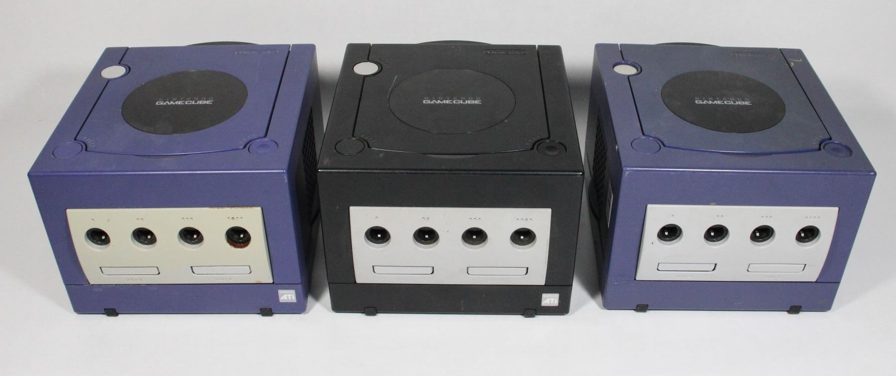 BLACK/PURPLE LOT OF 3 NINTENDO GAMECUBE GAME CUBE SYSTEMS ALL UNTESTED FOR RESTORATION REPAIR PARTS PROJECT