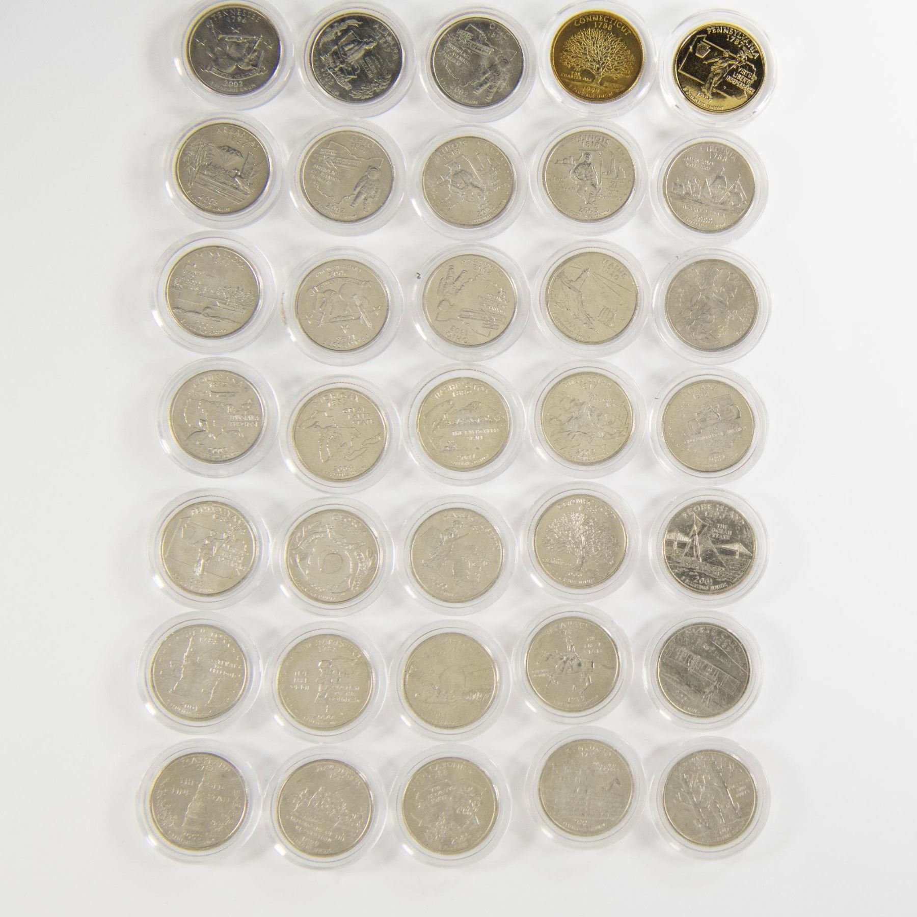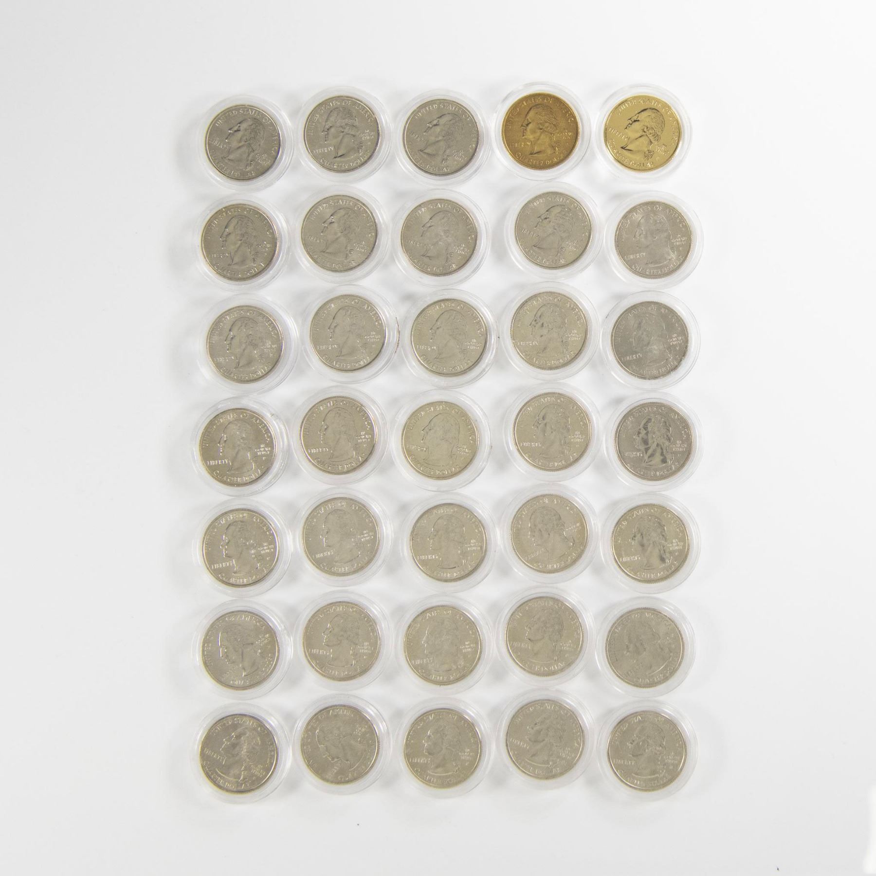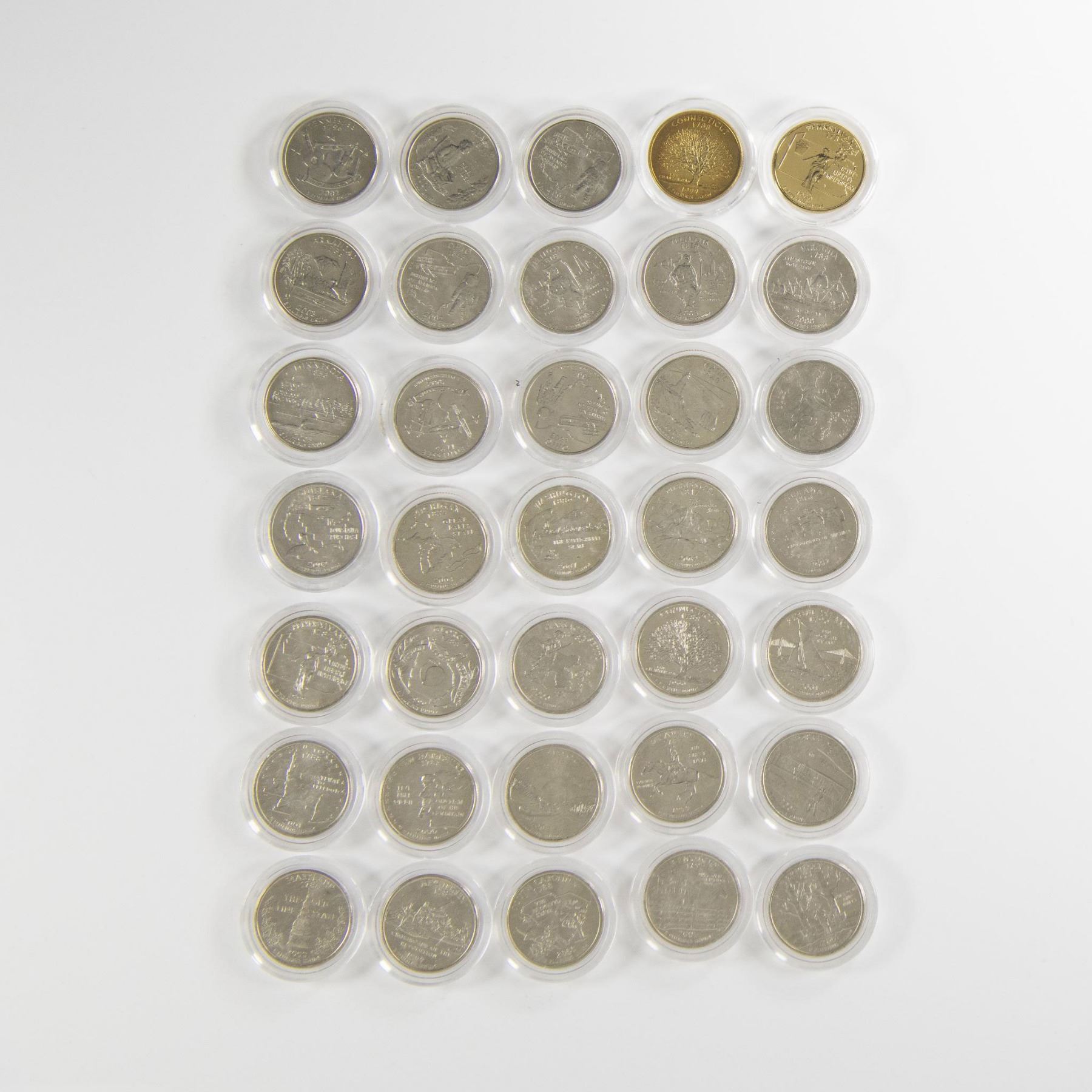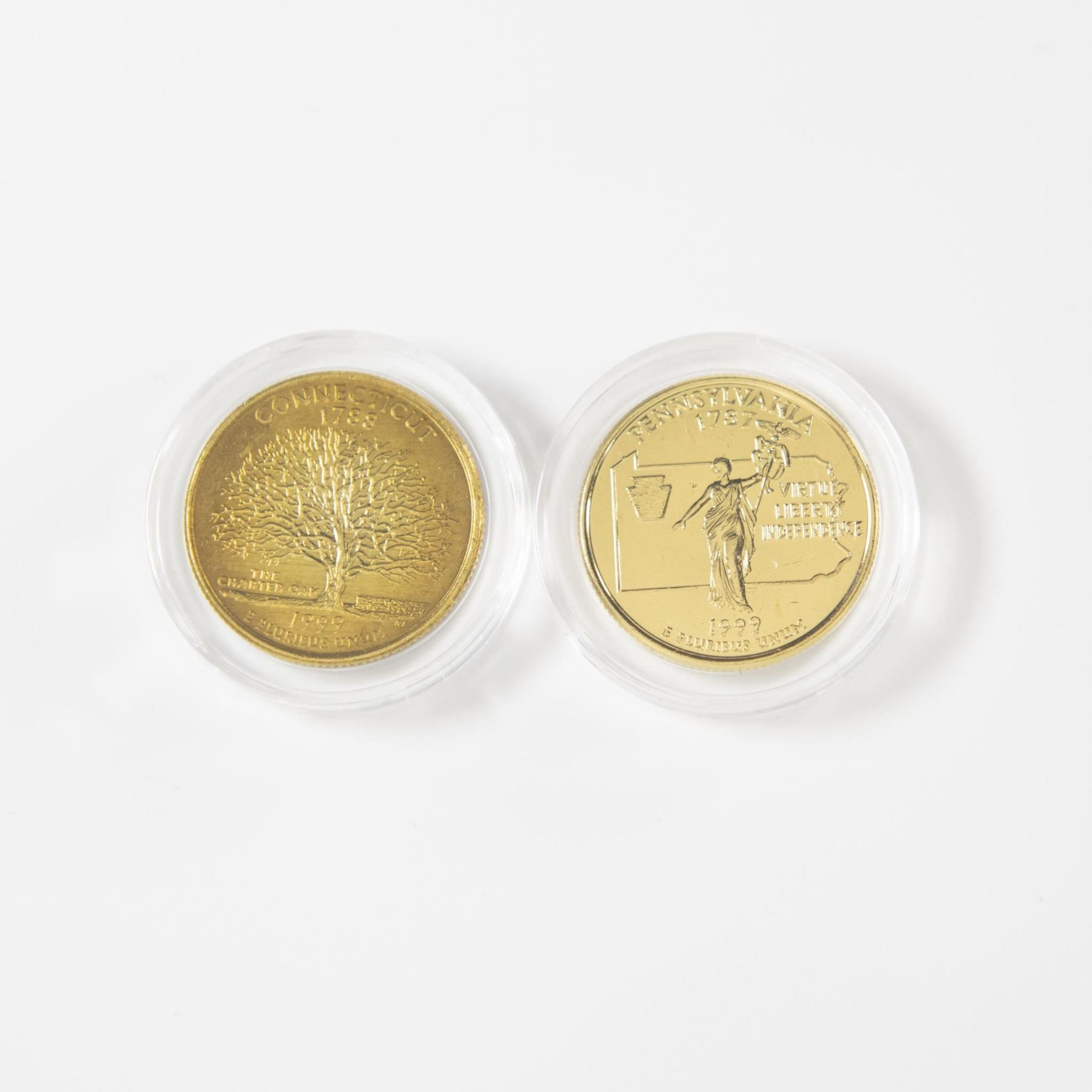 Philadelphia Mint. Denver Mint. A mix of 33 State quarters representing various states. Only 2 of the quarters are gold-plated: 1999-D Pennsylvania; and 1999-D Connecticut. Each coin is in a protective case. A case is approximately: 0.25"D x 1.25" dia. Includes a United States Commemorative Gallery cloth pouch: 3.75"L x 4"H.