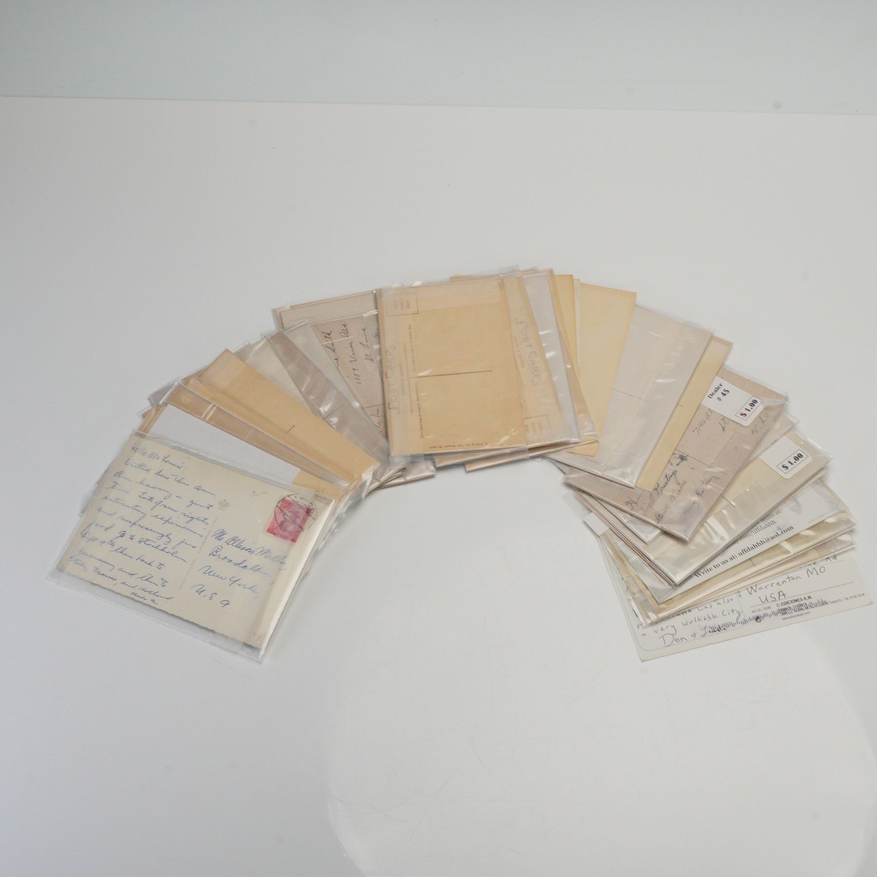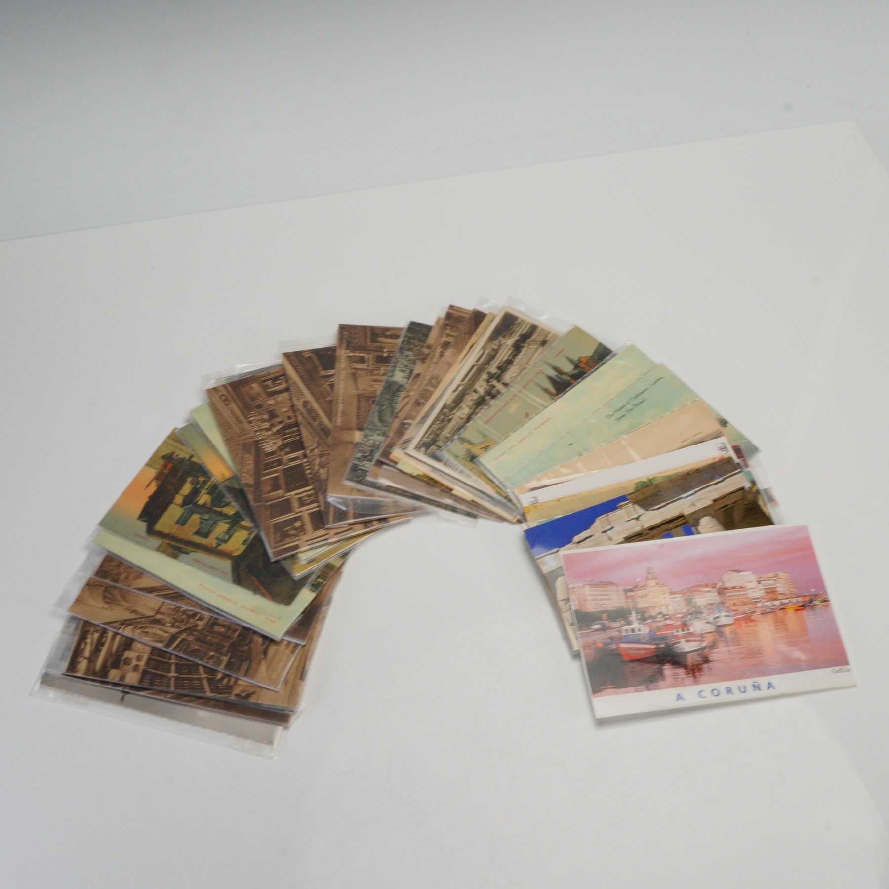 A diverse collection including architectural landmarks, coastal views, and urban street scenes from domestic and international locales. Includes many postcards from London, one from A Coruna Spain, and one from Propylaia Acropolis. The assortment includes both used and unused cards, some bearing period handwriting, and postage.