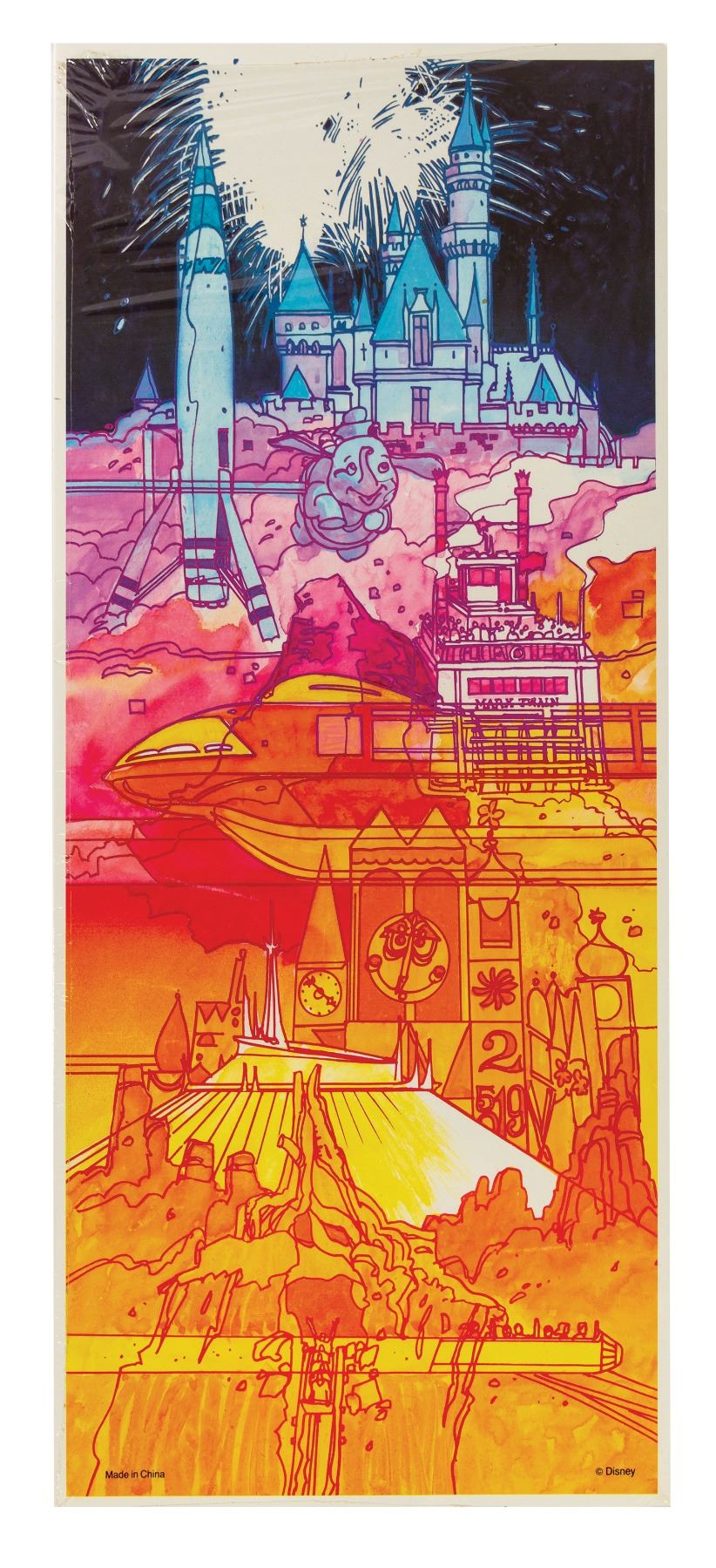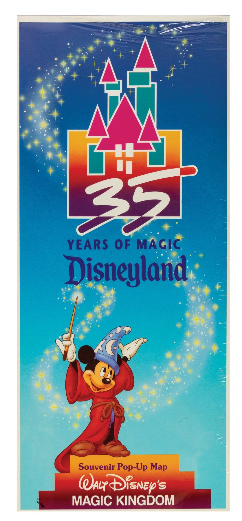 (Disneyland, 1990) A pop-up style park map created for Disneyland's 35th anniversary. This particular map is unopened, still in its original plastic wrap. Measuring 18"x8.25", the map is in very fine condition. The plastic wrap is opening slightly along the top-edge.