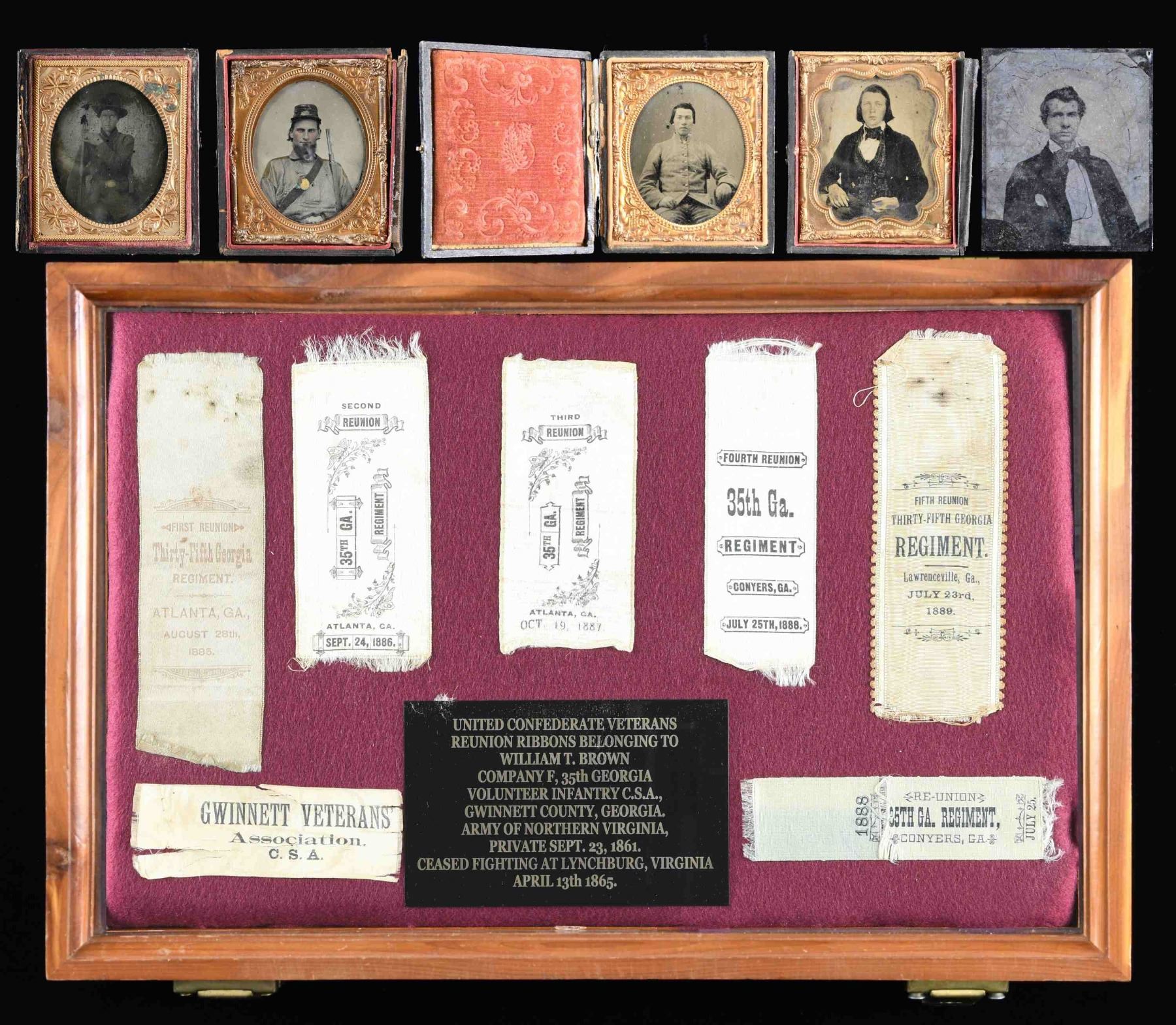 This grouping was displayed in the Stone Mountain Relics Shop Museum along with other local Dekalb /Gwinnett County Georgia regiments artifacts loaned by local Dekalb & Gwinnett County families. This group was in the GA case for many years until the museum closed about 2000. Grouping belonged to my good friend Tom Aderholdt (1948-2024) who I last saw at my old partner's funeral January 21, 2024 in Stone Mountain. The images were of his family members as are the 35th Georgia reunion ribbons. He was avid collector and obviously had no family to leave material to. Tom never married and lived with his mother who died just weeks after his death. I could not have been more surprised when this grouping showed up for me to catalog. A Local Gwinnet County picker bought a portion of his Tom's residence where among other things were Tom's boy scout uniform, his uncle's navy P-coat, and some of Tom's reenactor gear. The ribbons are still in the case with reader board that SMR had made about 1990, the Confederate soldier images are missing their reader boards identifying them, but one is William T. Brown (likely bearded image) who served 1861-1865 and maybe more than one image are him. The 5 images are 1/6TH plate ambrotypes or tintypes: