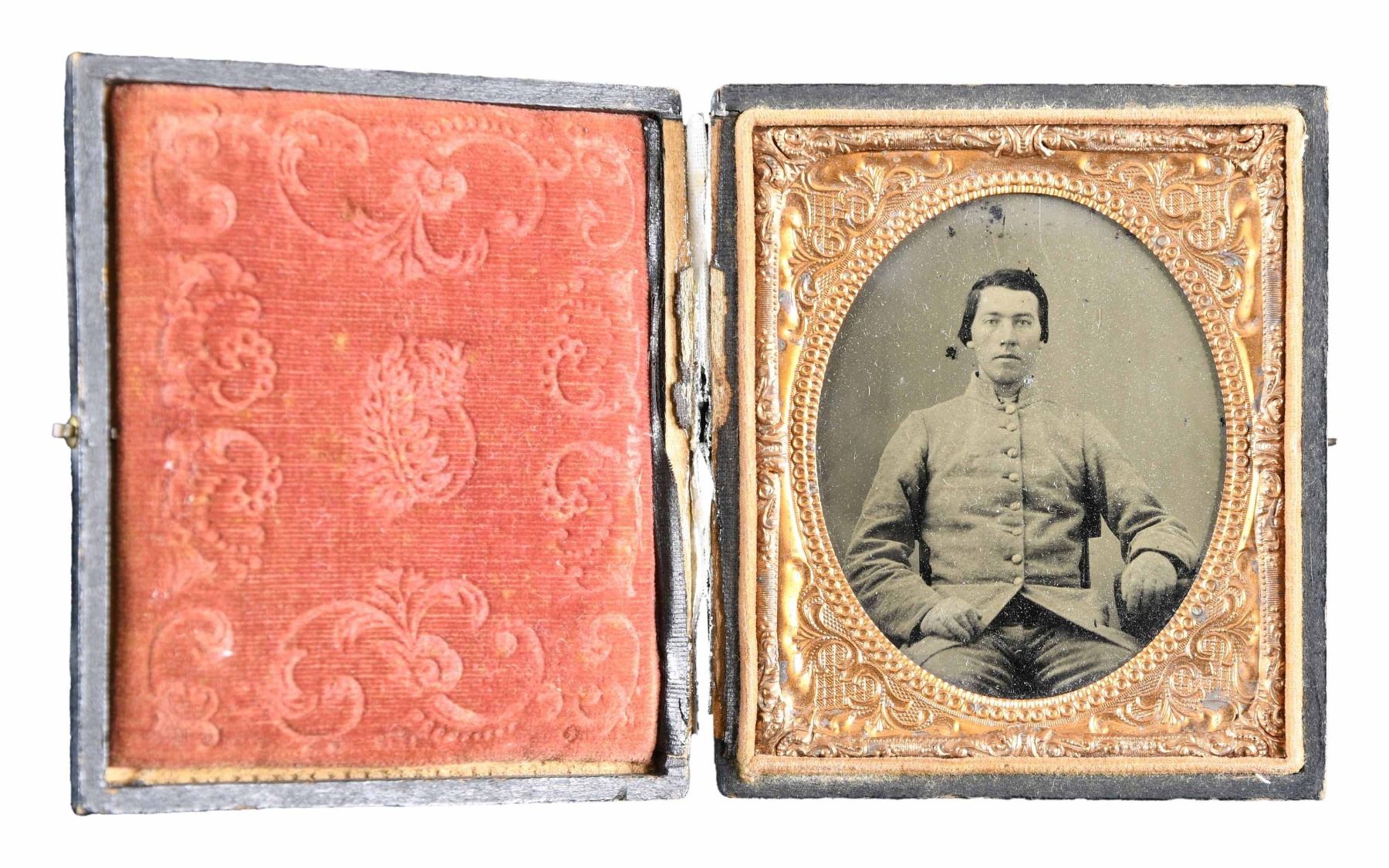 2. Ambrotype, Jasper Webb, 35th Georgia, wearing homespun enlisted frock coat, 8 buttons are gilded, good detail and photographer may be same for the bearded soldier. This image has penciled name in back "Jasper Webb / Walton Co / Ga". Records show Jasper Webb died at Winchester in 1862 from disease. Good overall, few spots in emulsion unaffected subject. Case has a glued repair to hinge.