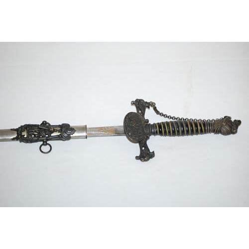 36 1/2" FRATERNAL SWORD - E.A. ARMSTRONG DETROIT MICH. W/ NICKEL PLATED METAL SCABBARD W/ FCB SHIELD ETCHED DECORATED BLADE J.C. RICHARDS, BRASS FITTINGS & BLACK LEATHER GRIP W/ BRASS WRAP, HAND GUARD, ETC. - GOOD CONDITION, MINOR WEAR & IMPERFECTIONS