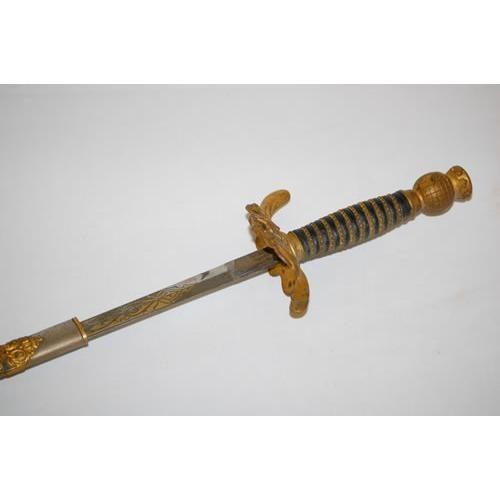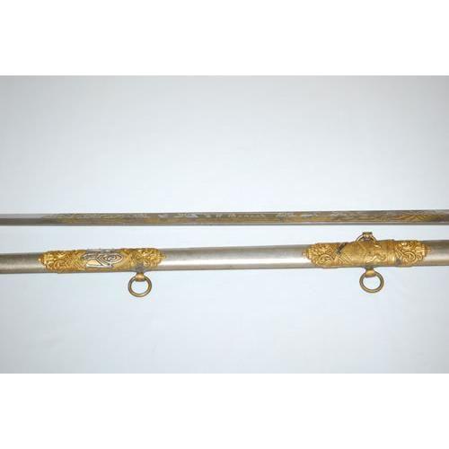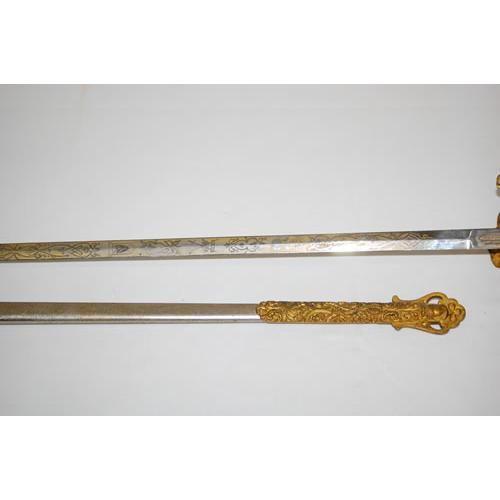 36 1/2" FRATERNAL SWORD - M.C. LILLEY & CO. COLUMBUS OH W/ NICKEL PLATED METAL SCABBARD W/ BRASS FITTINGS & ETCHED BLADE W/ GOLD HIGHLIGHTS J.T. OSGOOD, BLACK LEATHER GRIP & BRASS WRAP, HAND GUARD, ETC. - GOOD CONDITION, MINOR IMPERFECTIONS