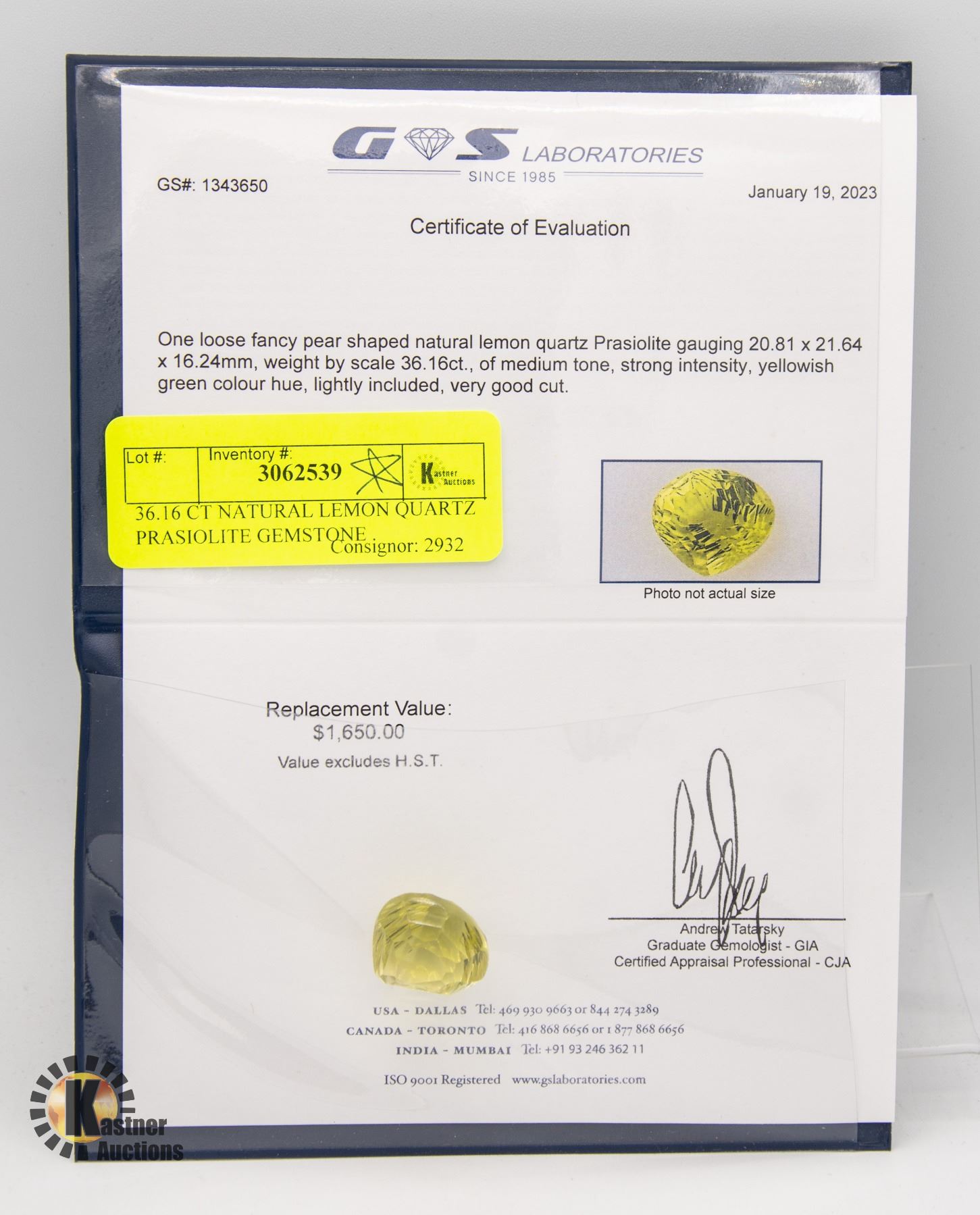 MEASURING 20.81 X 21.64 X 16.24mm, TONE IS MEDIUM, STRONG INTENSITY, YELLOWISH GREEN COLOR HUE, LIGHTLY INCLUDED, CUT IS VERY GOOD. COMES WITH COA FROM G S LABORATORIES WITH REPLACEMENT VALUE OF $1,650.00