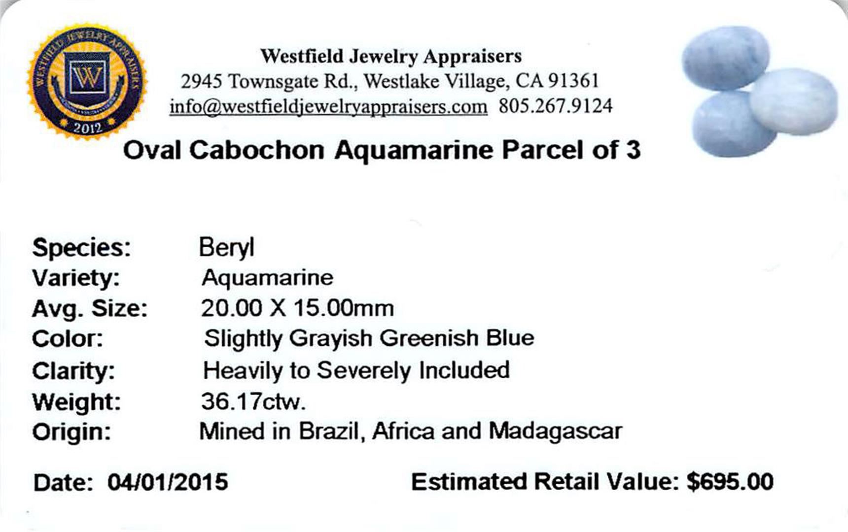 Three oval cabochon cut natural aquamarines exact total weight 36.17ct., clarity is heavily included, type I, medium, slightly grayish, very slightly greenish blue color, (GIA vslgB 5/2), cut is good. Westfield Appraised at $695.00.