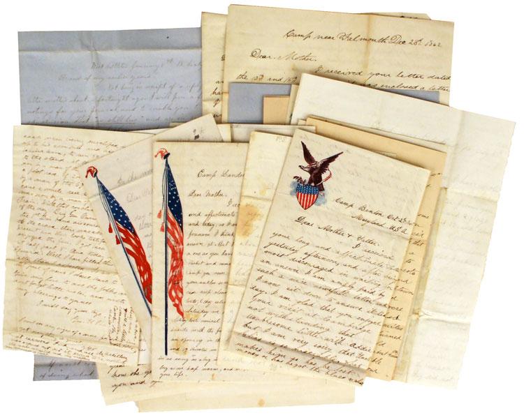 Civil War letter archive of George H. Patch of the 19th Massachusetts Infantry, Company I, POW at Antietam. 36 war-dated letters contain a wealth of battle content and span from October 1861 to March 1864. Excerpts: 2 October 1861, “…You probably heard of the battle at Munsons where through the blunders of drunken officers they succeeded in capturing 2 stove-pipes and 1 wooden gun, and killed more of our own men than of the enemy, and the other day an Irish Regt fired into a California Regt and shot 10 men and that is the characteristic of our officers who get drunk on the eve of battle and then when they should do their best commit the greatest blunder…” 9 April 1862, “…we were ordered out to reconnoiter the enemys batteries and protect the engineers while getting a plan of the enemys batteries. When we got within of a mile of their fort the Tiger Zouaves (Capt Wass) were sent out as skirmishers, and had rather a sharp engagement, but only 2 men wounded we next marched around to the other side of their fort and the Andrew Sharpshooters commenced to pick off their men a piece of shell struck a man in Co. D named Fountain in the fore shoulder and passed downward into his lung. He fell back and cried I am wounded and then some blood came out of his mouth, and he never spoke afterward, he died in about an hour…” 23 April 1862, “…There was a negro deserted from the Rebels the other day, and came over to our side who said that he left so as not to have to work guns, and he said that there were 8 regiments in this first battery who retreated into the woods near their fort and left their pickets in the fort and he said that all their guns went on wheels, so they cant have anything but field pieces and if so no heavy guns. The rebels dont know that we have gained such great victories as we have. One of the sharpshooters captured a wounded rebel and he says, Perhaps you can take Yorktown, but you cant take Fort Donelson, nor Island No. 10, nor Fort Pulaski, for they are impregnable. I think that if they knew how much they got defeated they would not fight at all…” 5 July 1862, near City Point, “…formed a line of battle on a huge hill The rebels commenced shelling at us about 5 oclock and our regt was ordered to support a batteryat past 5, the 69th Penn. formed a line on the brow of the hill The colonel went out in front of them and said now my lads give it to them, and with an awful yell they started on a run own the hill across the plain to the edge of the woods. Then the fight commenced after about of an hour of fighting the enemy gave away and fell back about a mile…” 17 October 1862, Camp Parole, “…When we got to Staunton we were put in cattle cars and had a most uncomfortable ride for 135 miles. When we reached Richmond marched to the Libby Prison on Carey Street and kept us a week and one day and half starved us. Monday we marched down to Aikens Landing and took the steamer for Annapolis…” 26 October 1862, Camp Parole, “…I will tell you how I came to be taken prisoner. When our front gave away (we were the right of the second line) we faced to the right and went out into a plowed field where we formed a line in right angles to the place where we were before. We lost a large number of men by rebel shot and shell and had to leave that position and fall back. I kept firing as I retreated until I came to a little house at the end of the field and there was about 20 wounded men there and one of them was Sergeant Powers of Co. I and he had a hole in his leg that you could put your hand in and he was bleeding very fast when up came a rebel and said he you must come along with me and right behind him were about 50 of them. I was taken to the rear and laid all day where I could see the battle going on…” 21 December 1862, “…There only 14 men in our company fit for duty. At the battle of Fredericksburg, we had two killed and 9 wounded. Jim Smith was regimental marker and was wounded in arm by a piece of shell, not dangerous however…” 18 March 1864, “…Some of the recruits were little boys not more than 14 or 15 years old and wont stand a single march. It is a shame to enlist such boys. For it not only defrauds the government but many of them will get sick and die out here…” Mailing folds. Otherwisel excellent condition.