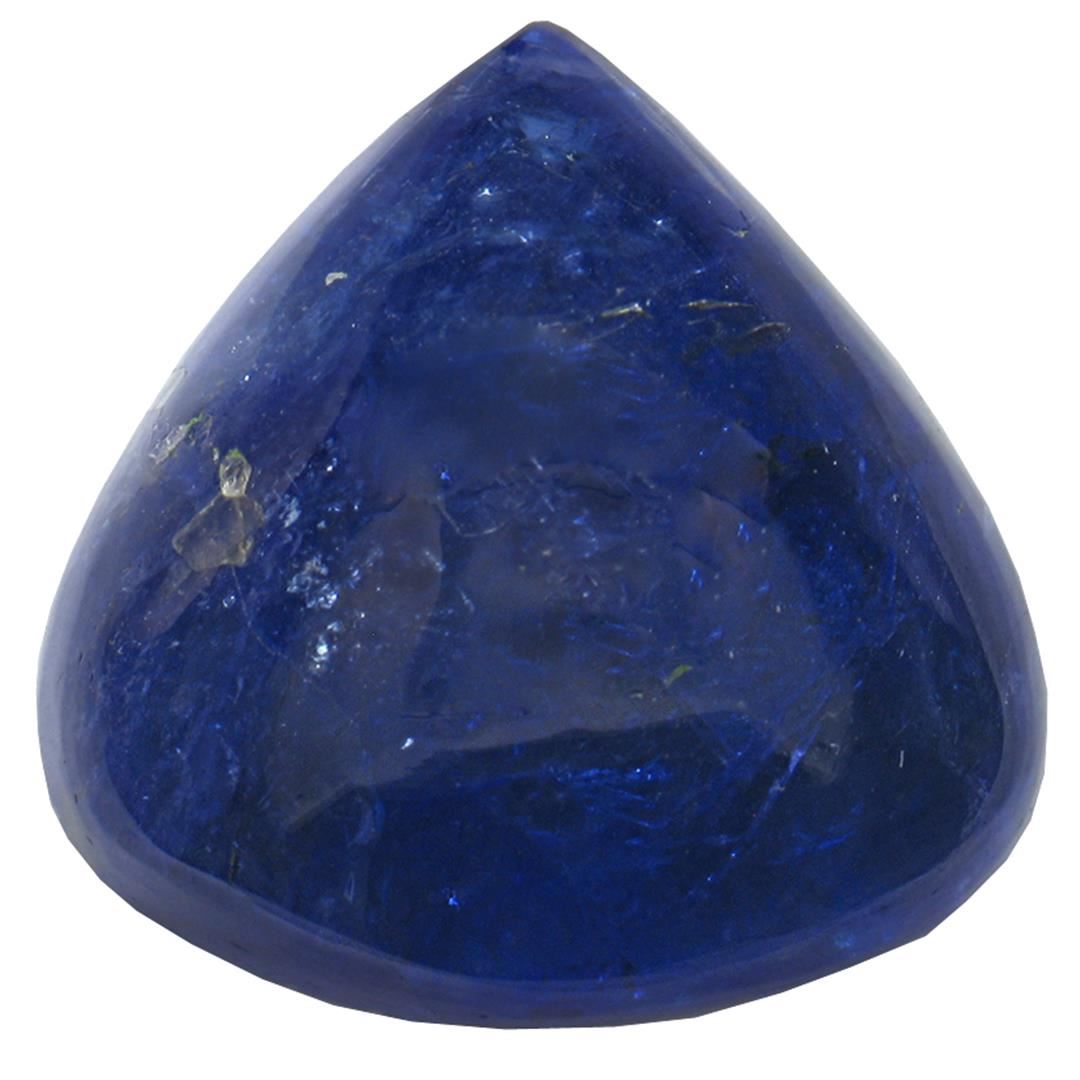 One triangle cabochon cut natural tanzanite, measuring 21.00 x 21.00 x 11.00mm, exact weight 36.24ct., clarity is heavily included, type I, dark, very slightly grayish, blue color, (GIA B 7/3), cut is good. Transmitting light somewhat diffusely, transparent to translucent. Naturally occurring internal & external characteristics are present. Indications of heat treatment. Westfield Appraised at $3,480.00.