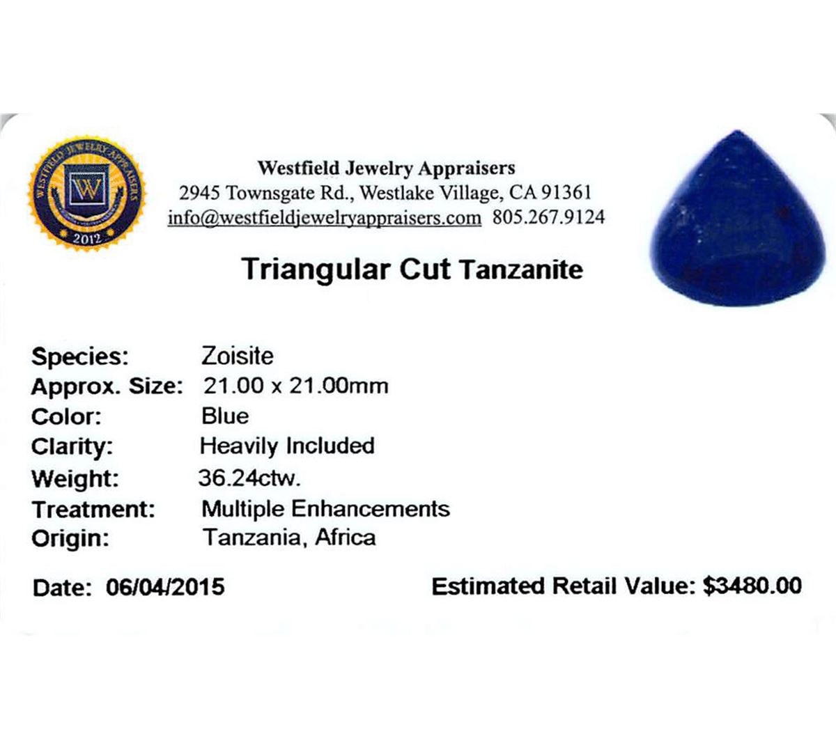 One triangle cabochon cut natural tanzanite, measuring 21.00 x 21.00 x 11.00mm, exact weight 36.24ct., clarity is heavily included, type I, dark, very slightly grayish, blue color, (GIA B 7/3), cut is good. Transmitting light somewhat diffusely, transparent to translucent. Naturally occurring internal & external characteristics are present. Indications of heat treatment. Westfield Appraised at $3,480.00.