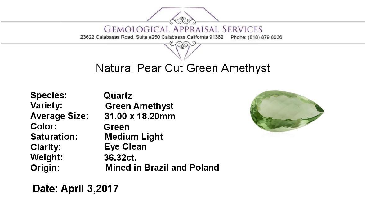 One natural pear cut green amethyst with an exact weight of 36.32ct., clarity is eye clean, green, medium light. Gemological Appraisals Services estimates the retail value at $726.4 GAS Appraised.