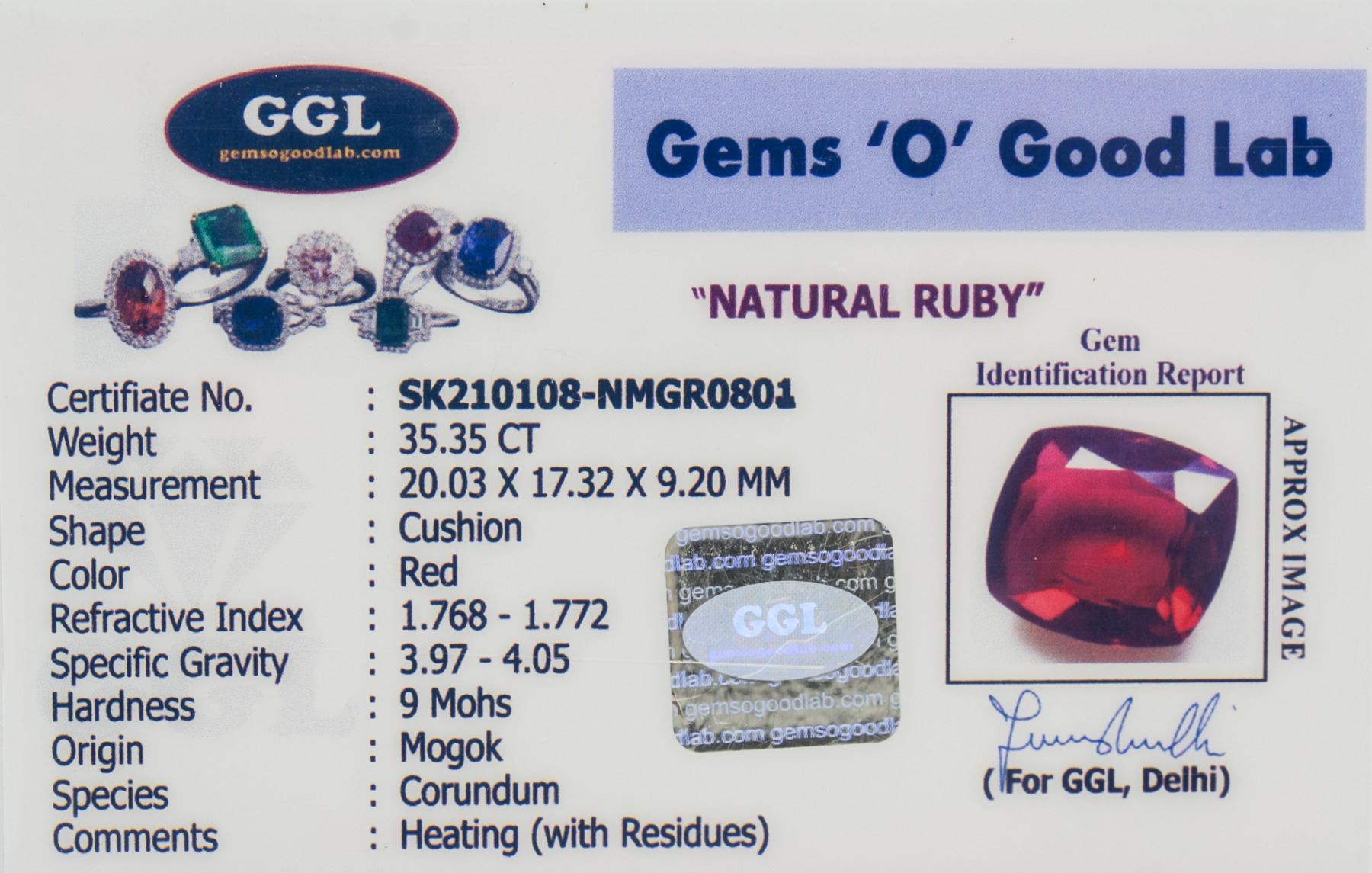 One (1) 36.36 ct cushion cut red natural ruby. Origin: Mogok. Accompanied with GGL certificate. 20.03 x 17.32 x 9.20 mm.