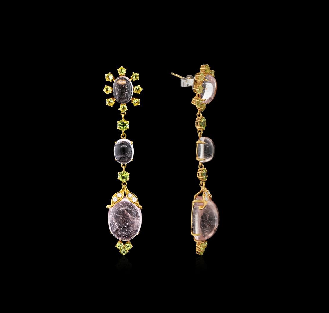 One pair of earrings featuring: 18KT rose gold weighing 7.35 grams containing morganite with a total weight of 36.45ct and peridots with a total weight of 3.01ct and diamonds with a total weight of 0.20ct.