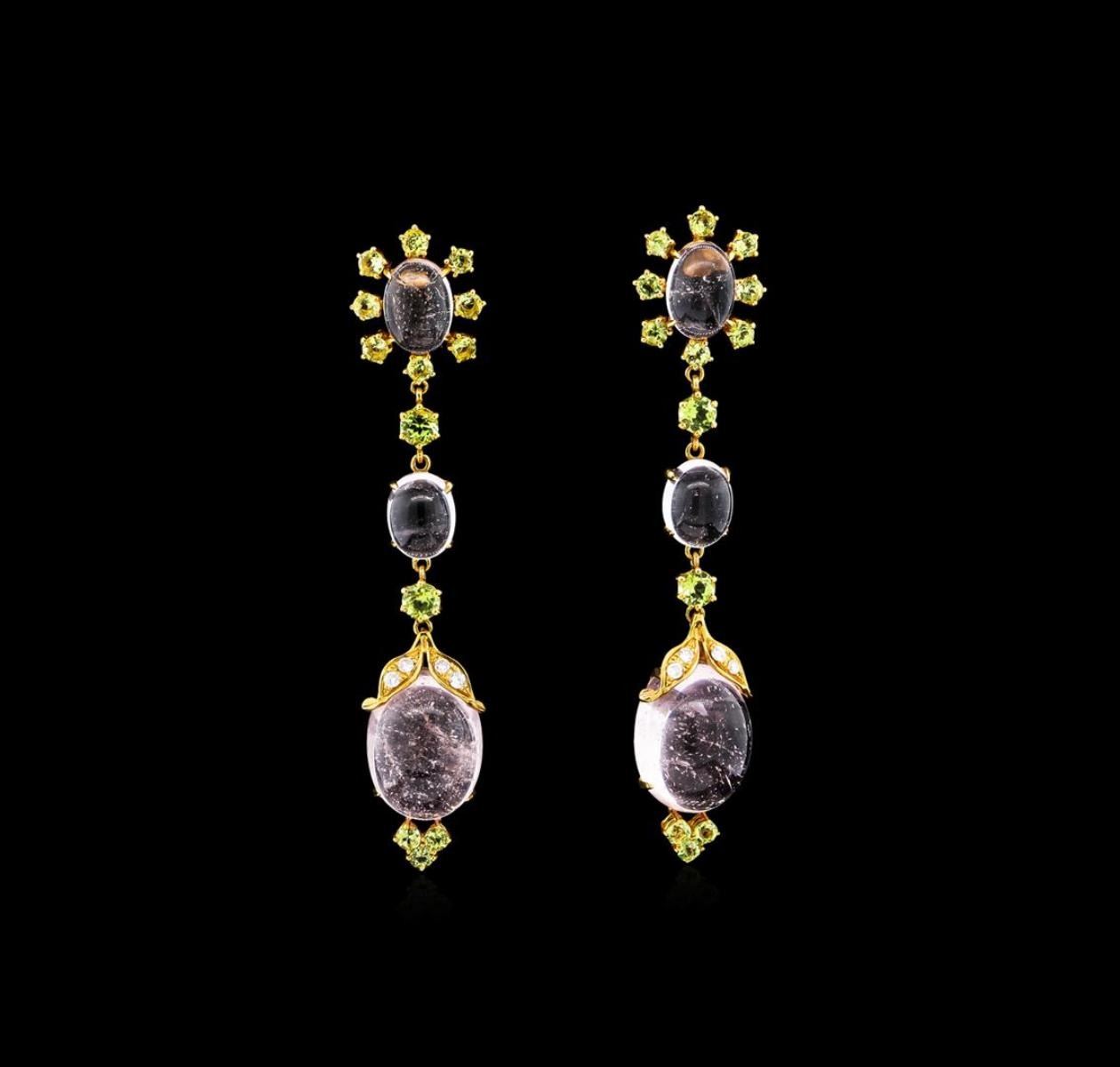 One pair of earrings featuring: 18KT rose gold weighing 7.35 grams containing morganite with a total weight of 36.45ct and peridots with a total weight of 3.01ct and diamonds with a total weight of 0.20ct.