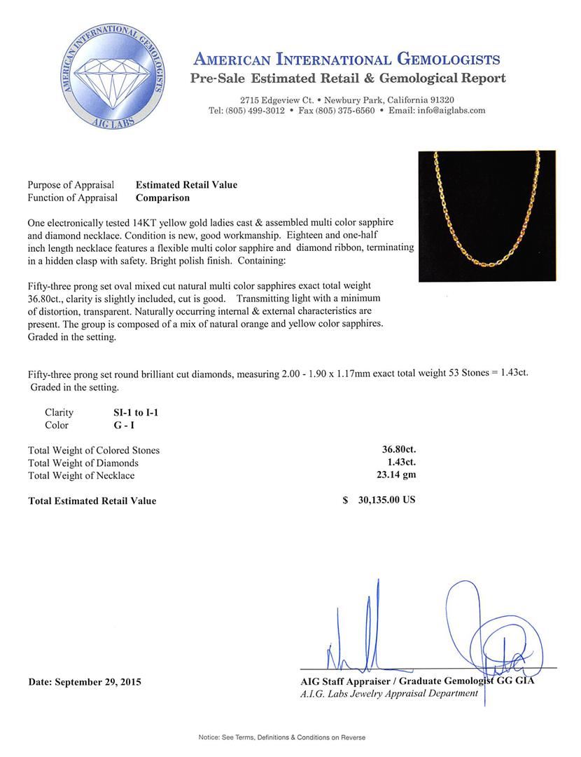One electronically tested 14KT yellow gold ladies cast & assembled multi color sapphire and diamond necklace. Eighteen and one-half inch length necklace features a flexible multi color sapphire and diamond ribbon, terminating in a hidden clasp with safety. Bright polish finish. Condition is new, good workmanship. Containing: Fifty-three prong set oval mixed cut natural multi color sapphires exact total weight 36.80ct., clarity is slightly included, cut is good. Transmitting light with a minimum of distortion, transparent. Naturally occurring internal & external characteristics are present. The group is composed of a mix of natural orange and yellow color sapphires. Graded in the setting. Fifty-Three prong set round brilliant cut diamonds, measuring 2.00 - 1.90 x 1.17mm exact total weight 53 Stones = 1.43ct. Graded in the setting. Clarity: SI-1 to I-1. Color: G - I. Total Weight of Colored Stones 36.80ct. Total Weight of Diamonds 1.43ct. Total Weight of Necklace 23.14gm. AIG Appraised at $30,135.00.