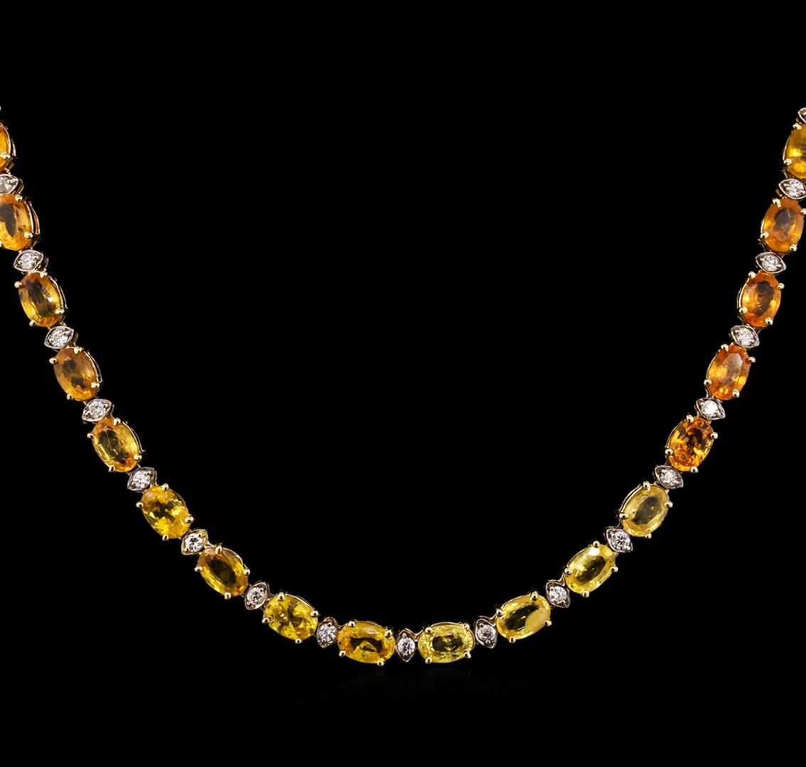 One electronically tested 14KT yellow gold ladies cast & assembled multi color sapphire and diamond necklace. Eighteen and one-half inch length necklace features a flexible multi color sapphire and diamond ribbon, terminating in a hidden clasp with safety. Bright polish finish. Condition is new, good workmanship. Containing: Fifty-three prong set oval mixed cut natural multi color sapphires exact total weight 36.80ct., clarity is slightly included, cut is good. Transmitting light with a minimum of distortion, transparent. Naturally occurring internal & external characteristics are present. The group is composed of a mix of natural orange and yellow color sapphires. Graded in the setting. Fifty-Three prong set round brilliant cut diamonds, measuring 2.00 - 1.90 x 1.17mm exact total weight 53 Stones = 1.43ct. Graded in the setting. Clarity: SI-1 to I-1. Color: G - I. Total Weight of Colored Stones 36.80ct. Total Weight of Diamonds 1.43ct. Total Weight of Necklace 23.14gm. AIG Appraised at $30,135.00.