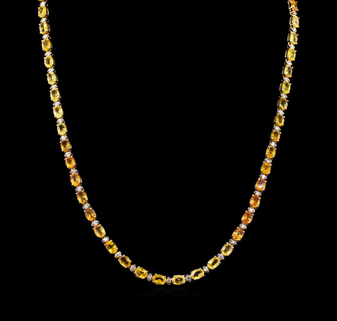 One electronically tested 14KT yellow gold ladies cast & assembled multi color sapphire and diamond necklace. Eighteen and one-half inch length necklace features a flexible multi color sapphire and diamond ribbon, terminating in a hidden clasp with safety. Bright polish finish. Condition is new, good workmanship. Containing: Fifty-three prong set oval mixed cut natural multi color sapphires exact total weight 36.80ct., clarity is slightly included, cut is good. Transmitting light with a minimum of distortion, transparent. Naturally occurring internal & external characteristics are present. The group is composed of a mix of natural orange and yellow color sapphires. Graded in the setting. Fifty-Three prong set round brilliant cut diamonds, measuring 2.00 - 1.90 x 1.17mm exact total weight 53 Stones = 1.43ct. Graded in the setting. Clarity: SI-1 to I-1. Color: G - I. Total Weight of Colored Stones 36.80ct. Total Weight of Diamonds 1.43ct. Total Weight of Necklace 23.14gm. AIG Appraised at $30,135.00.