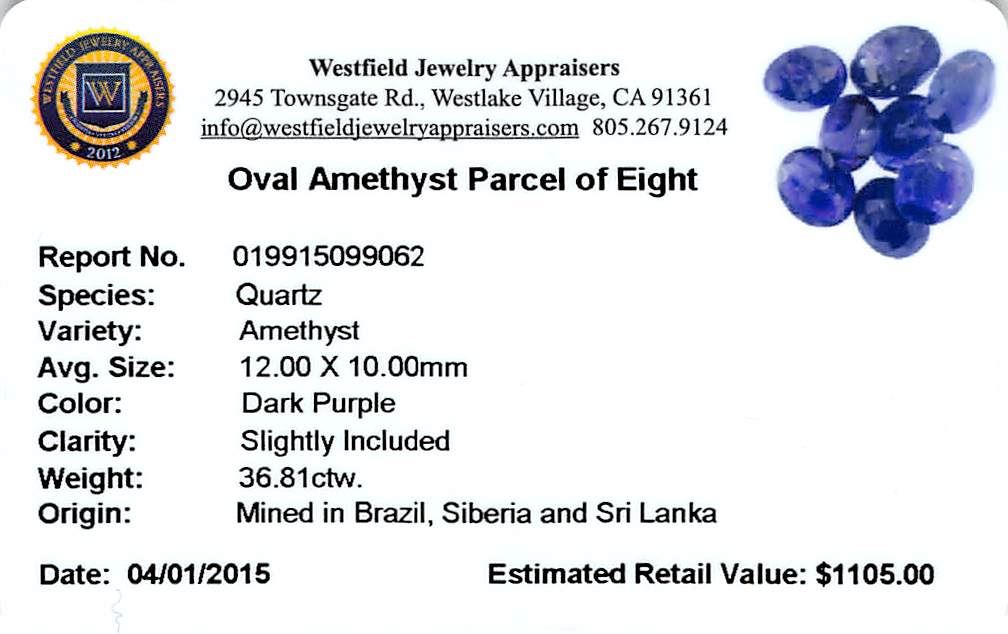 Eight oval mixed cut natural amethysts exact total weight 36.81ct., clarity is slightly included, type II, dark, very slightly grayish, purple color, (GIA P 7/3), cut is good. Westfield Appraised at $1,105.00.
