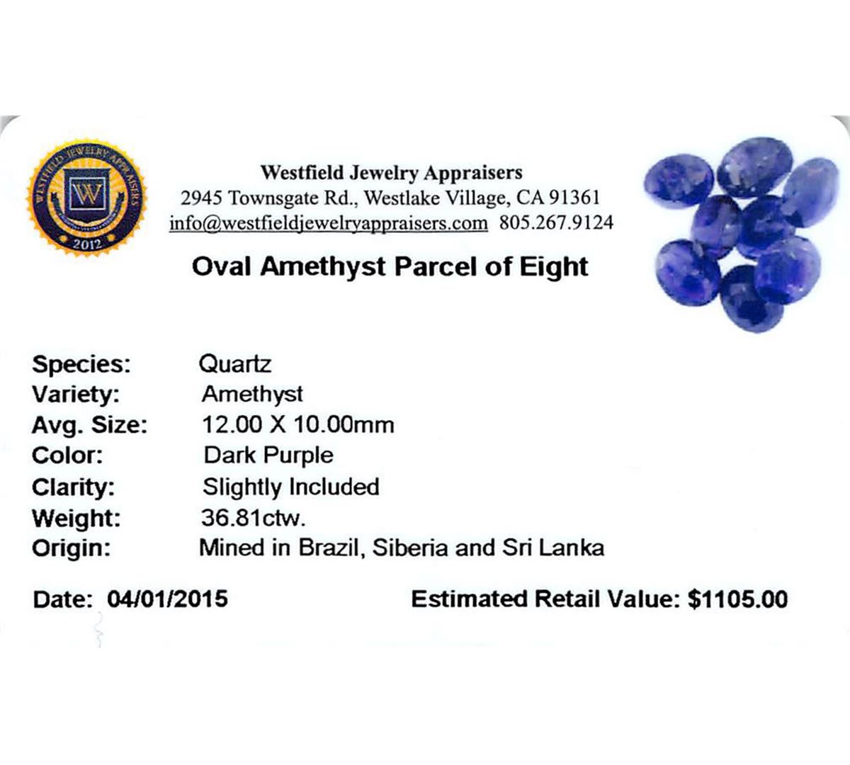 Eight oval mixed cut natural amethysts exact total weight 36.81ct., clarity is slightly included, type II, dark, very slightly grayish, purple color, (GIA P 7/3), cut is good. Westfield Appraised at $1,105.00.