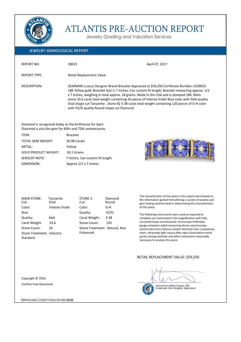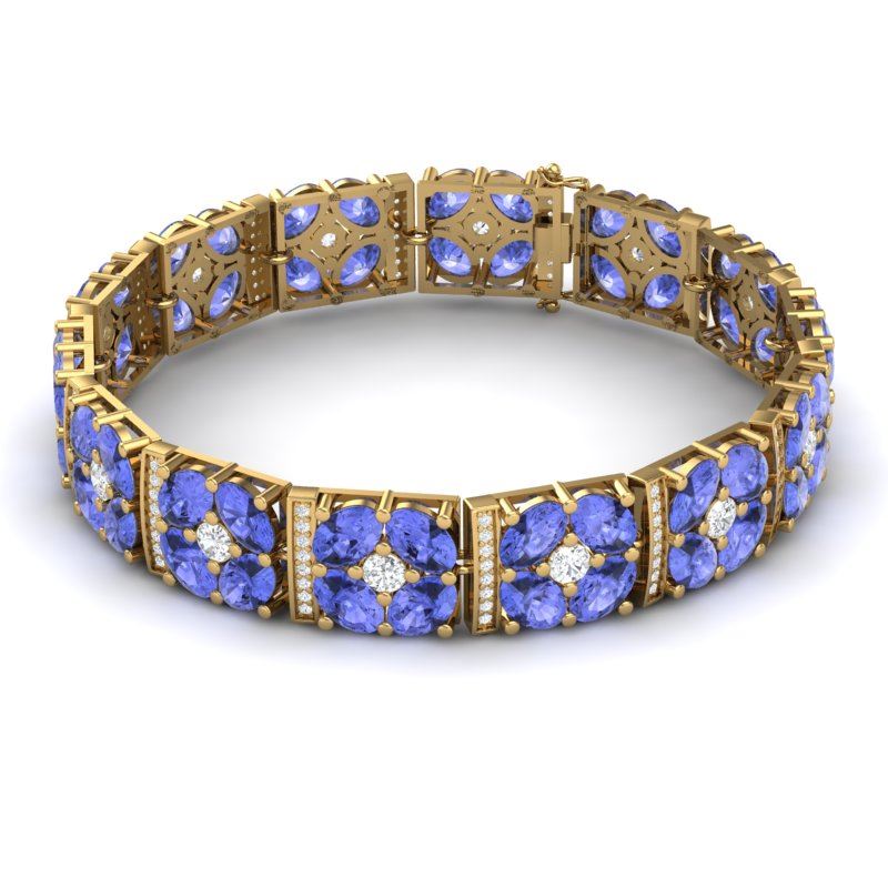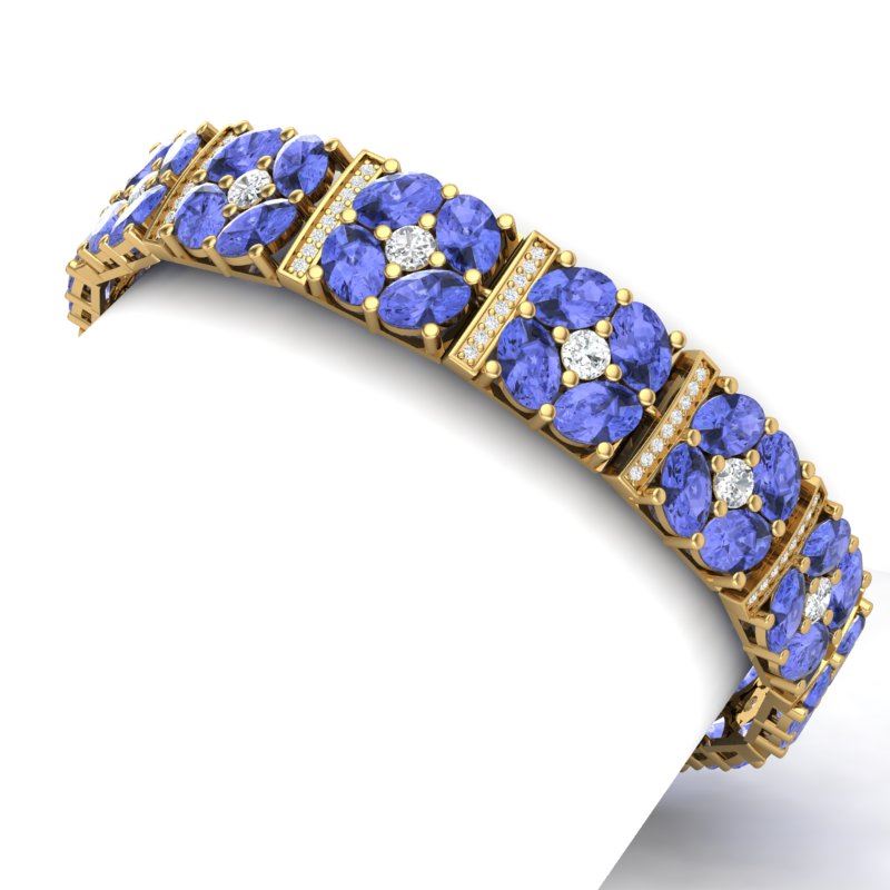 36.98 CTW Royalty Tanzanite & VS Diamond Bracelet 18K Yellow Gold ---- Luxury Designer Brand Bracelet Appraised Retail Price at $59,250 ---- SKU Number US39023 18K Yellow gold Bracelet Size is 7 Inches, Can custom fit length, Bracelet measuring approx. 1/2 x 7 Inches, weighing in total approx. 24 grams. Made in the USA and is stamped 18K, Main stone 33.6 carat total weight containing 56 pieces of Intense Violet Blue color with AAA quality Oval shape cut Tanzanite , Stone #2 3.38 carat total weight containing 120 pieces of G-H color with VS/SI quality Round shape cut