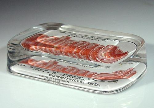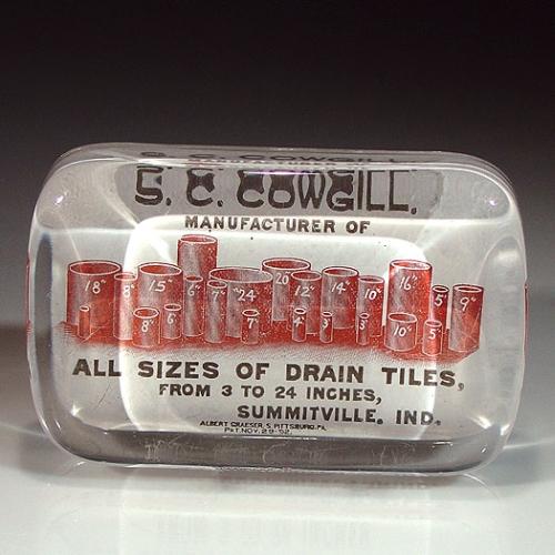 Antique rectangular advertising plaque paperweight, with a drawing of several vertical drain pipes, in assorted sizes, which are bordered by the words, "S.C. Cowgill, Manufacturer of All Sizes of Drain Tiles, From 3 to 24 Inches, Summitville, Ind.", printed in black, on white ground. Length 4", width 2 1/2". NO RESERVE