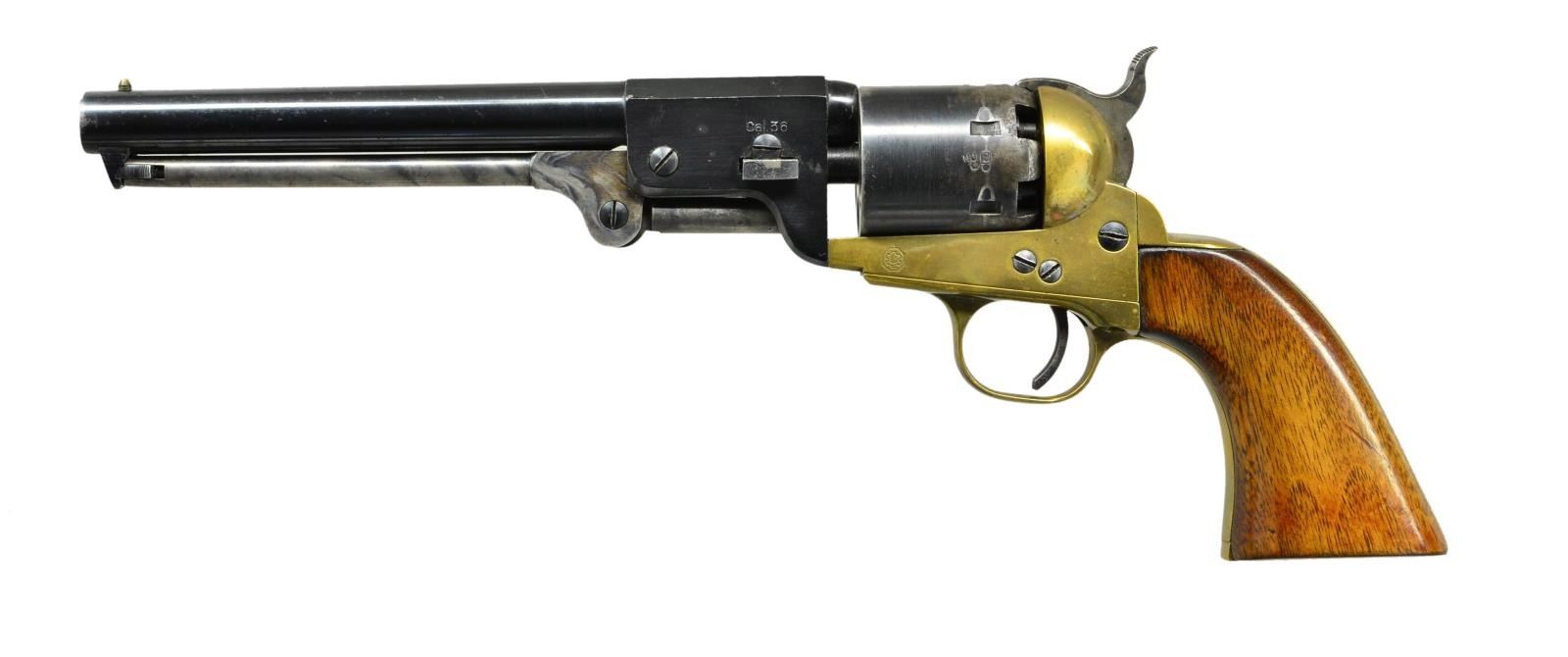 Cal. 36. S# 021815. Bbl. 7.5". Navy Arms cap & ball pistol. Blued barrel & cylinder. Brass frame. Hardwood 2 pc. grips. CONDITION: bluing coverage on barrel retains full finish. Cylinder demonstrates thinning around lock grooves. Only a few small impressions on grip panels. Bright bore w/ sharp rifling. (01-21331/JZ). ANTIQUE. $100-200.