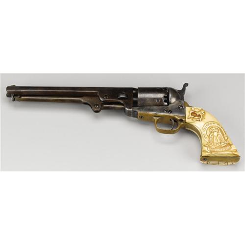<B>A 'Confederate Colt' Revolver- Hand-Carved Ivory Grips of Virginia State Seal marked Mitchell & Tyler from the Albaugh Collection</B></I> This unmarked six-shot 7" barreled .36 caliber revolver is Confederate made based on the .36 caliber Navy model of 1851. The striking detail work on the pistol grips is quite amazing, especially the hand-carved grips made into the form of the Virginia state seal done in deep bas-relief including the Virginia Latin motto "Sic Semper Tyrannis" translated to "thus always to tyrants" above the name "Virginia". An interlocking "CS" has been carved above the state seal.The grips are marked "Mitchell and Tyler" inside indicating they were crafted by the premier military outfitter of the Confederacy in Richmond, Virginia. The reverse of the grips are striking in appearance as well. An arrangement of 8 brass rivets capped by a five-pointed brass star, the ivory is beautifully carved to maximize the utility of the grip.<BR> The revolver has a brass back strap and trigger guard with all other metal parts being iron except for the pinched front sight inset into the top barrel flat, the metal for which may be gold. The back strap and trigger guard exhibit a deep, reddish-yellow patina. This revolver was part of the world-renowned William Albaugh Collection and has been illustrated extensively. This was William Albaugh's favorite Confederate pistol. <BR>There are two accompanying photographs of the gun in the Albaugh collection that are published in his book.<BR><BR><B>Provenance:</B></I> <I>The Tharpe Collection of American Military History; The William Albaugh Collection</B></I><BR><BR><B>Exhibited:</B></I> <I>The Liberty Heritage Society Museum</B></I><BR><BR><b>Shipping:</b> Miscellaneous Collectibles, Larg (<a target="_blank" href="http://www.heritageauctions.com/common/shipping.php">view shipping information</a>)