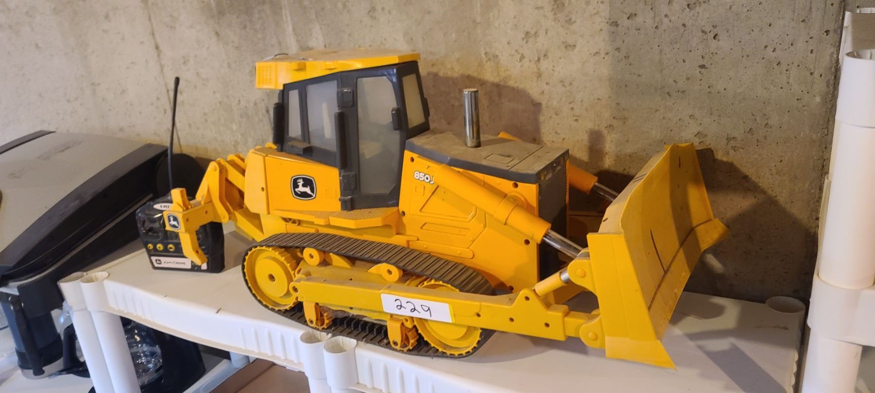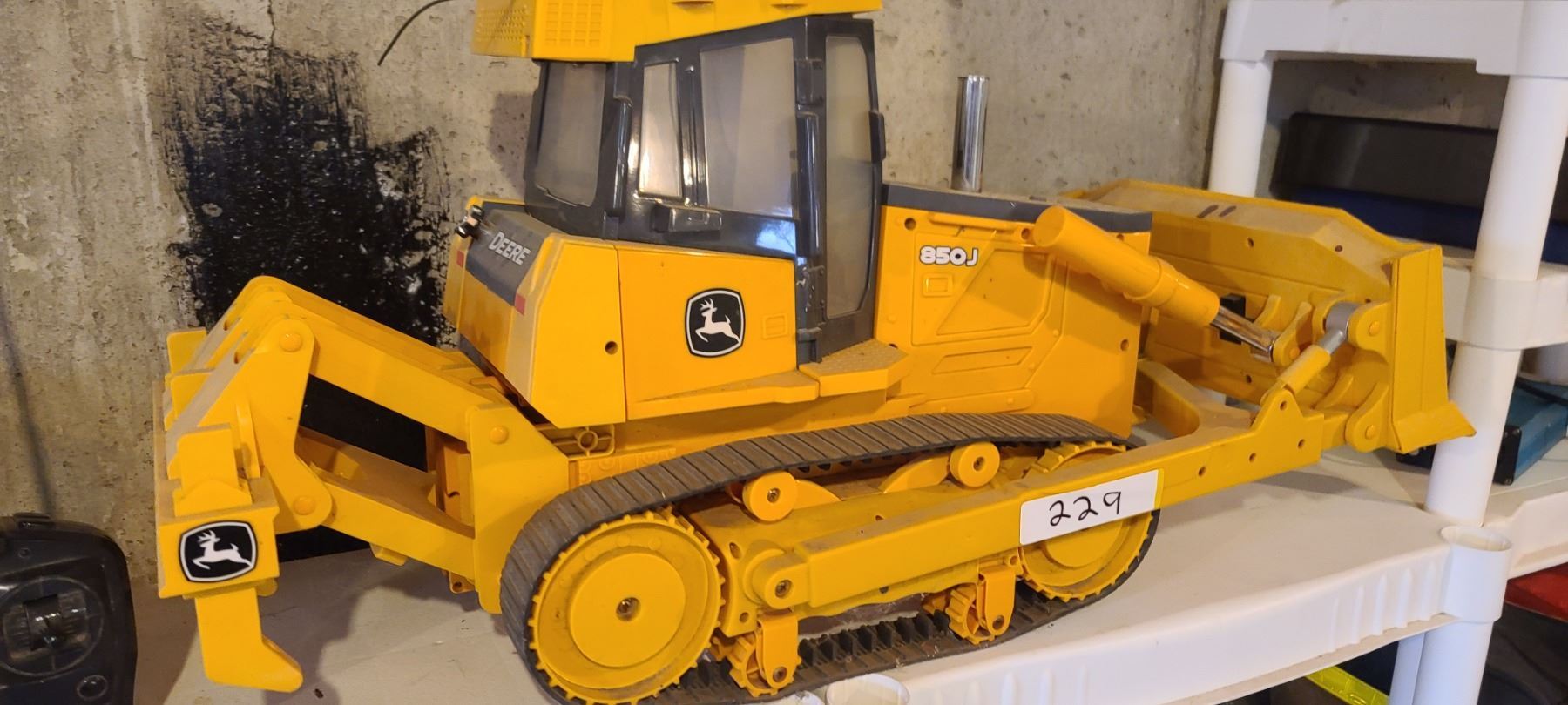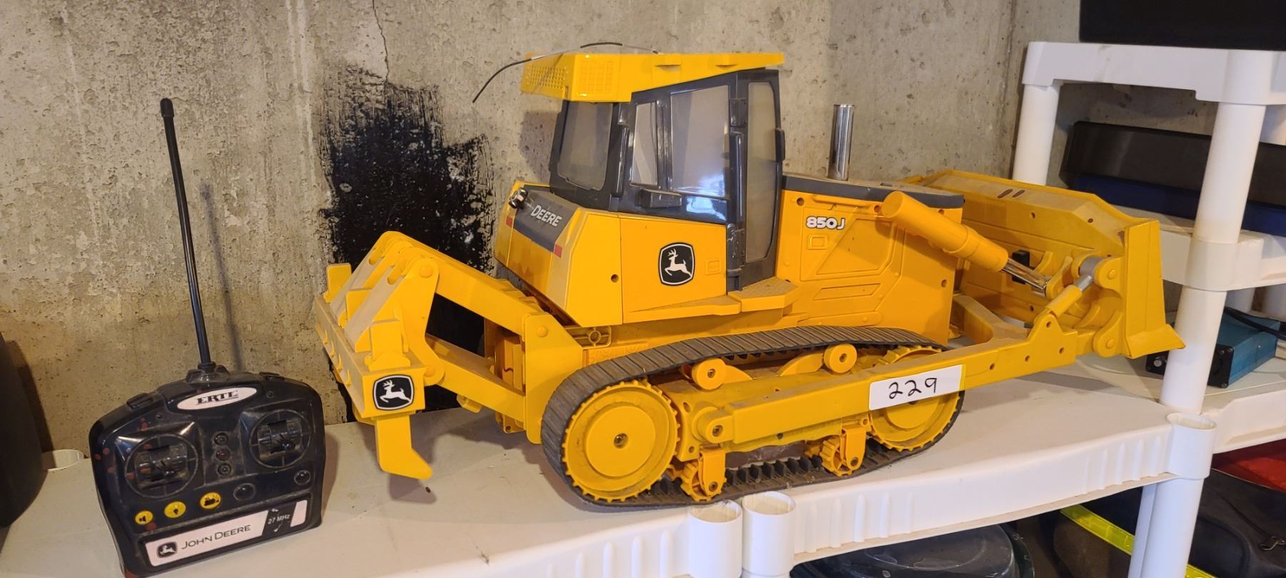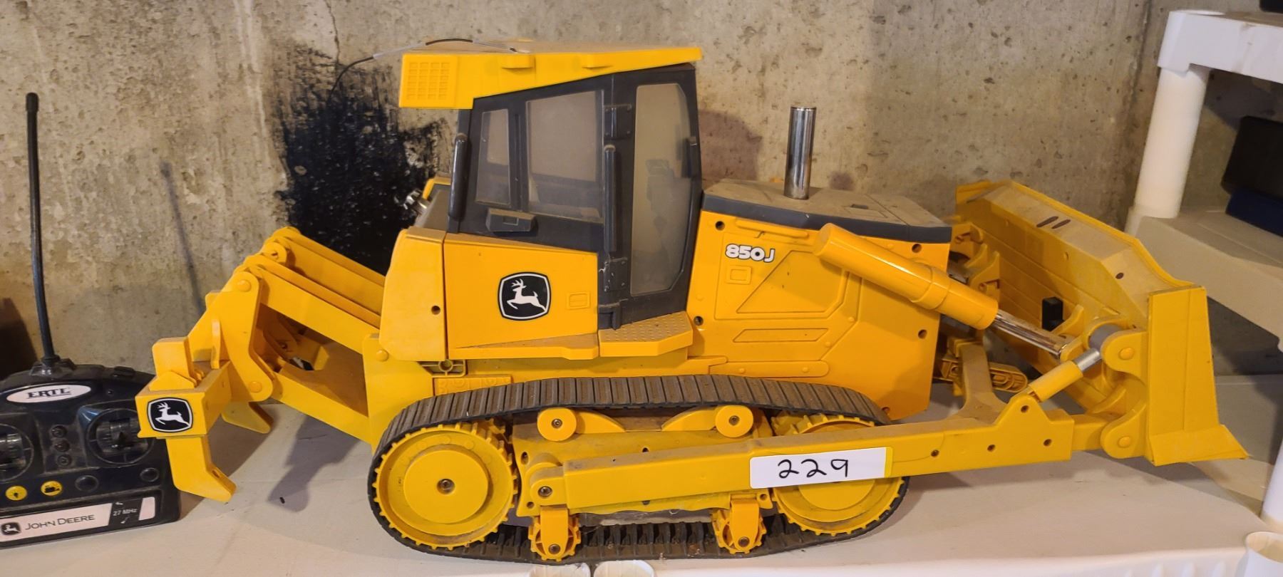 36 INCH PLASTIC JD 850J REMOTE CONTROLLED DOZER C/W CHARGER, REMOTE CONTROL, BATTERY MISSING