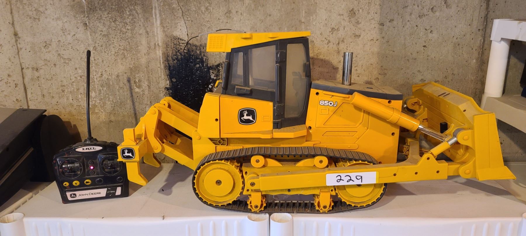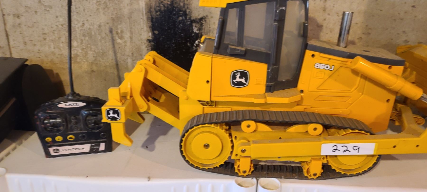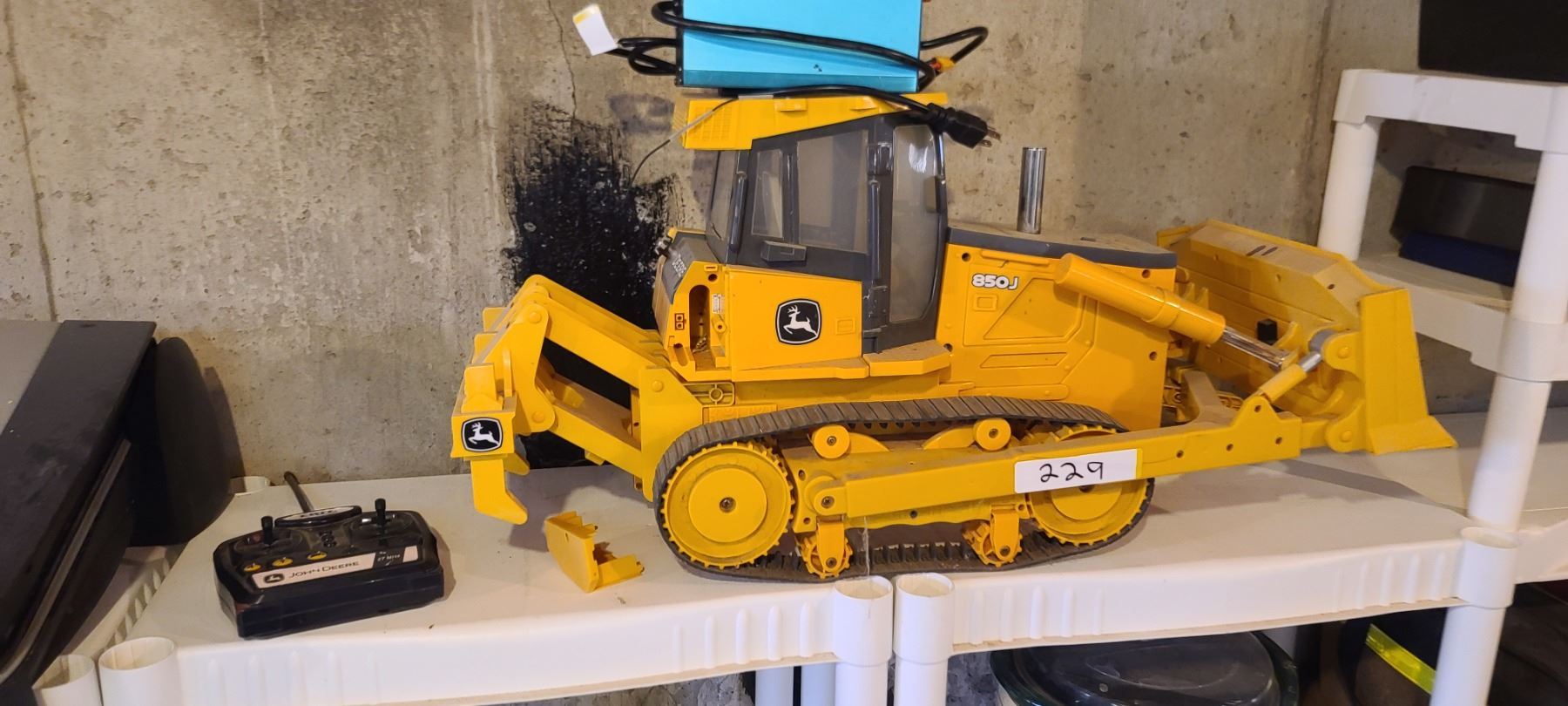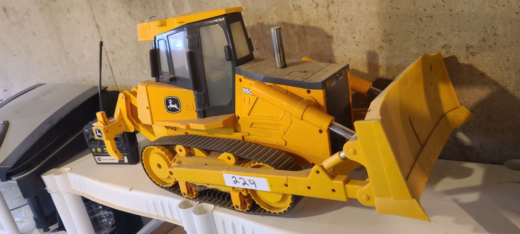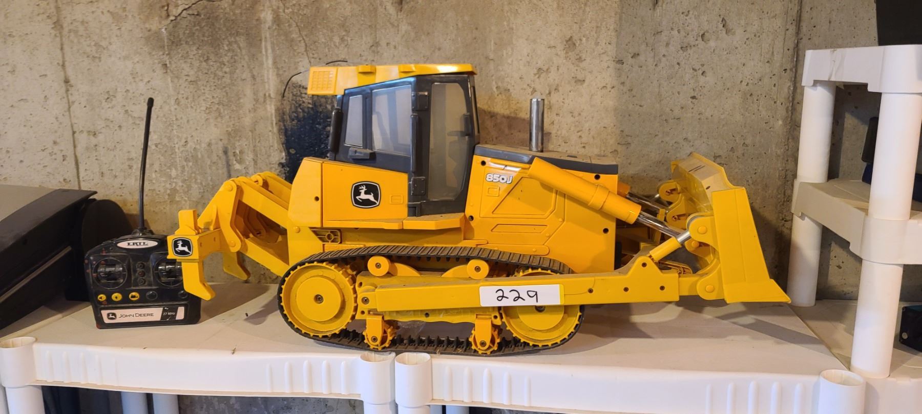 36 INCH PLASTIC JD 850J REMOTE CONTROLLED DOZER C/W CHARGER, REMOTE CONTROL, BATTERY MISSING