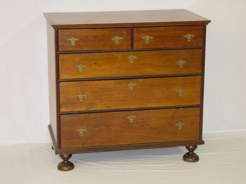 36" MA WILLIAM & MARY WALNUT 2 OVER 3 DRAWER CHEST W/ BALL FEET - REFINISHED, WEAR & IMPERFECTIONS