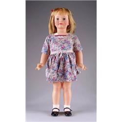 36" PATTY PLAYPAL IN O.B. Near mint vinyl doll in print dress with underwear, socks, and shoes, blonde hair with red ribbon. Extremely bright facial coloring. Dress has slight soiling. CONDITION: In unplayed with condition, never having been removed from box for display. Box is in good condition with tape marks and slight distressing. 1-1221