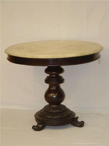 36" ROUND MARBLE TOP CENTER PEDESTAL WALNUT PARLOR TABLE ON CARVED BASE & CLAW FEET (36" DIAMETER, 29"H)- LOSSES, WEAR & IMPERFECTIONS