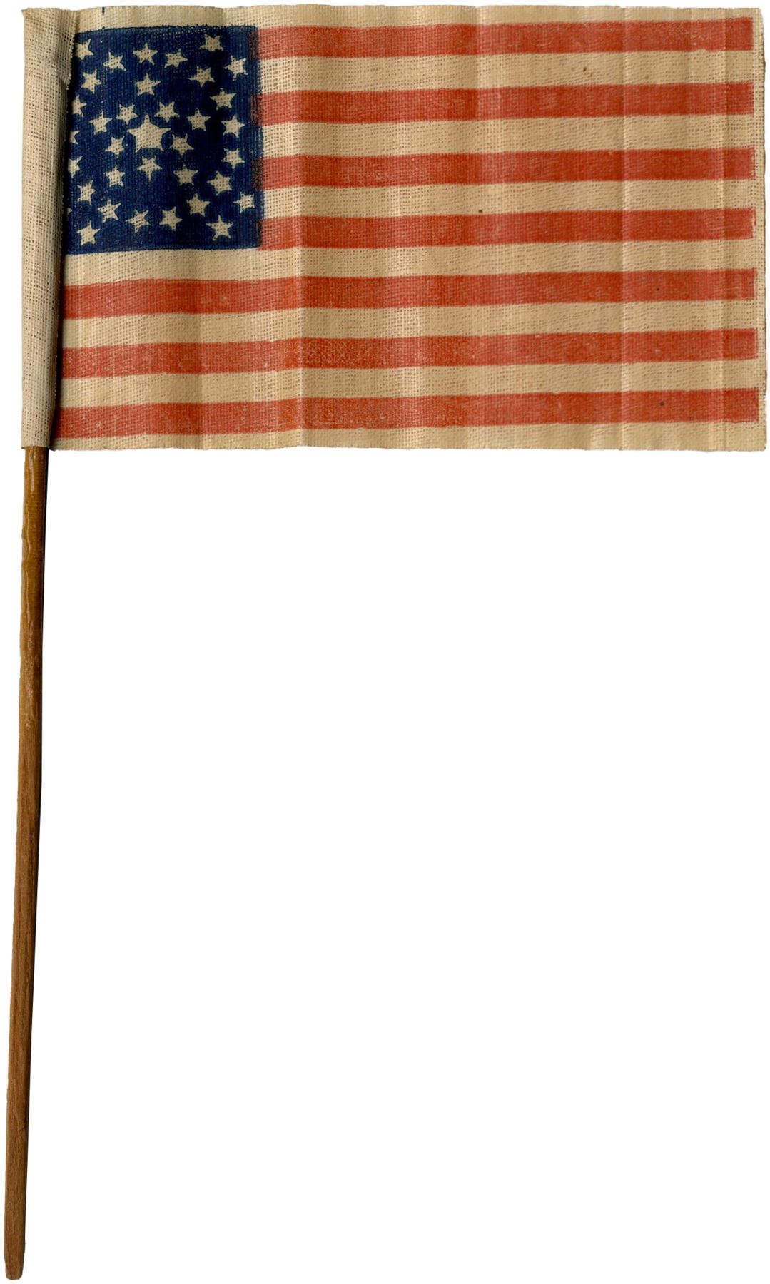 36-star flag after Nevada joined the United States on 31 October 1864, in the midst of the Civil War. Flag was made shortly thereafter, intended for waving during a parade. 36-star flag is configured with a ring of stars encircling the ''Great Luminary'' (stars configured in such a way that they resemble an even larger star) that surrounds the central star representing Nevada. Starched cotton flag is attached to a wooden staff measuring 7.25''. Flag itself measures 4'' x 2.5'', as wrapped around the staff. Light age discoloration and bottom of staff is splintered. Overall in very good plus condition.