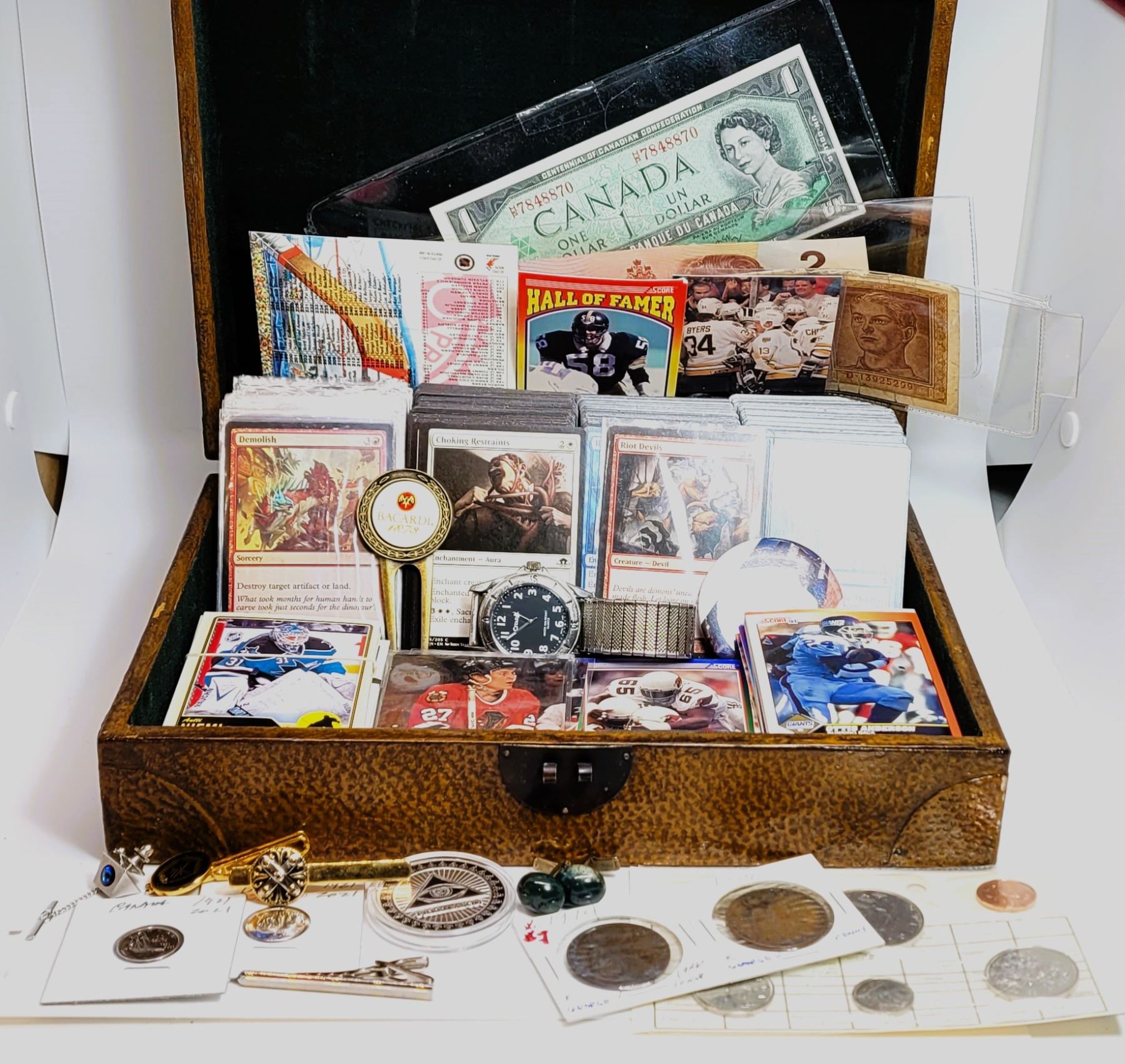 (CENTENNIAL) AND CDN $2.00 BILL, MAGIC THE GATHERING CARDS, CITADEL WATCH BY CARDINAL, NHL AND NFL TRADING CARDS, CUFF LINKS AND ASSORTED WORLD COINS. COLLECTIBLES