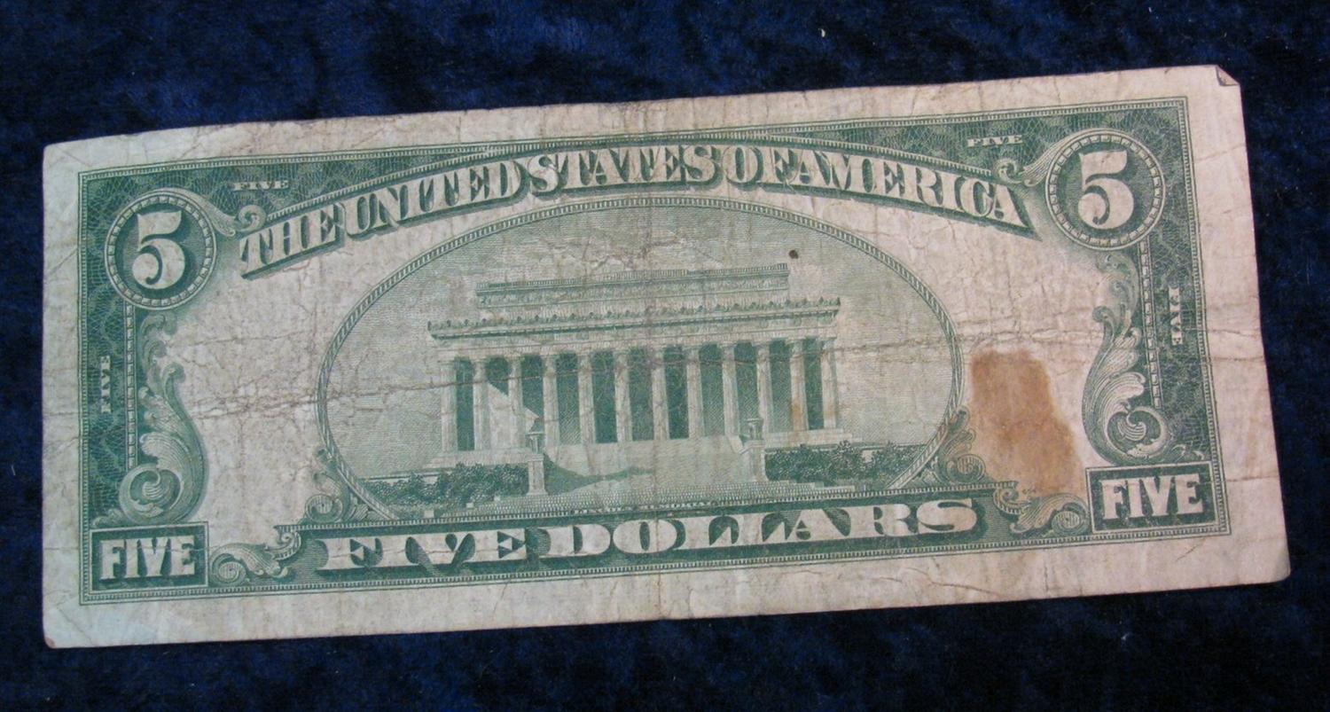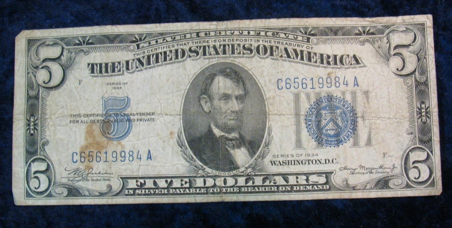 360. Series 1934 $5 Silver Certificate. VG. Some staining.