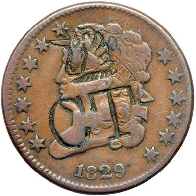 1829 C-1 R1 Obverse counterstamped with Unicorn and "CT" below, Brunk T-17. VF-20. Glossy medium brown. The unicorn design and large CT are strongly impressed on the obverse. According to Brunk, these stamps were most likely made to advertise Unicorn and CT cigars. This example is clearly superior to the Brunk plate coin for the variety.