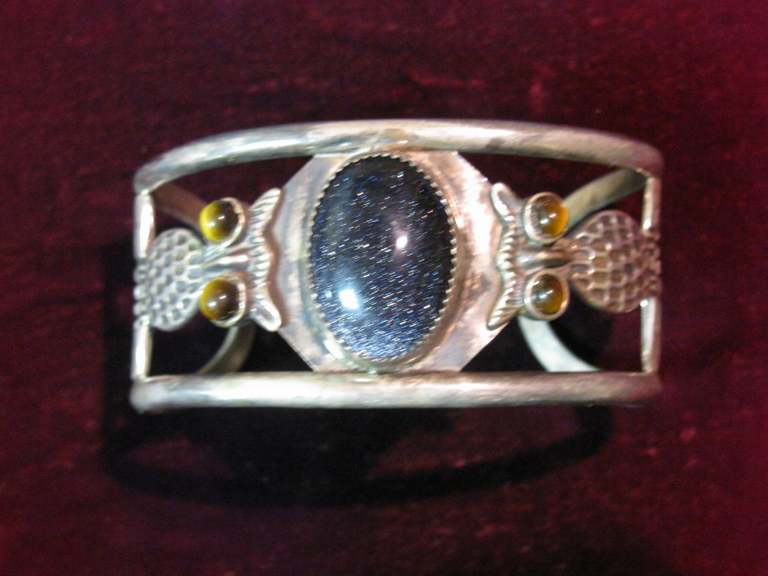 363. Sterling Silver Owl Bracelet with Tigereyes for the eyes and set with at least a 35 carat Black Goldstone center set. Weighs well over 1 and a half ounces. Originally priced at $275.00.