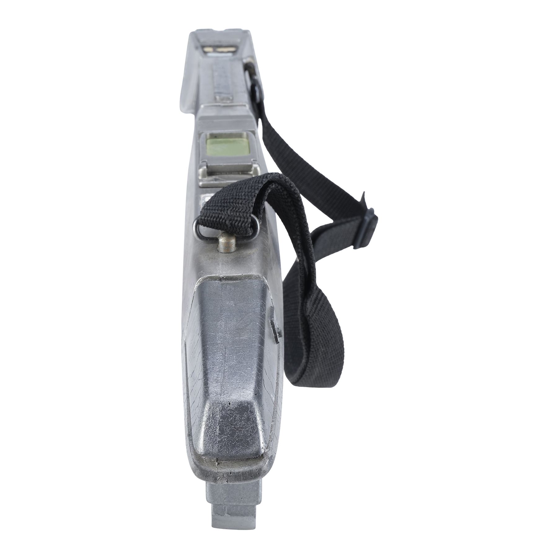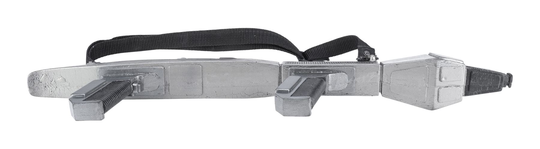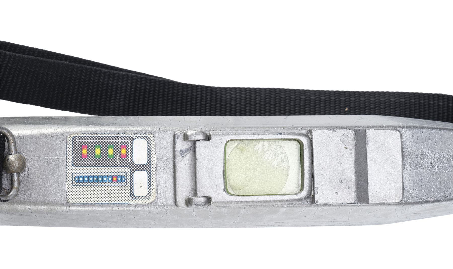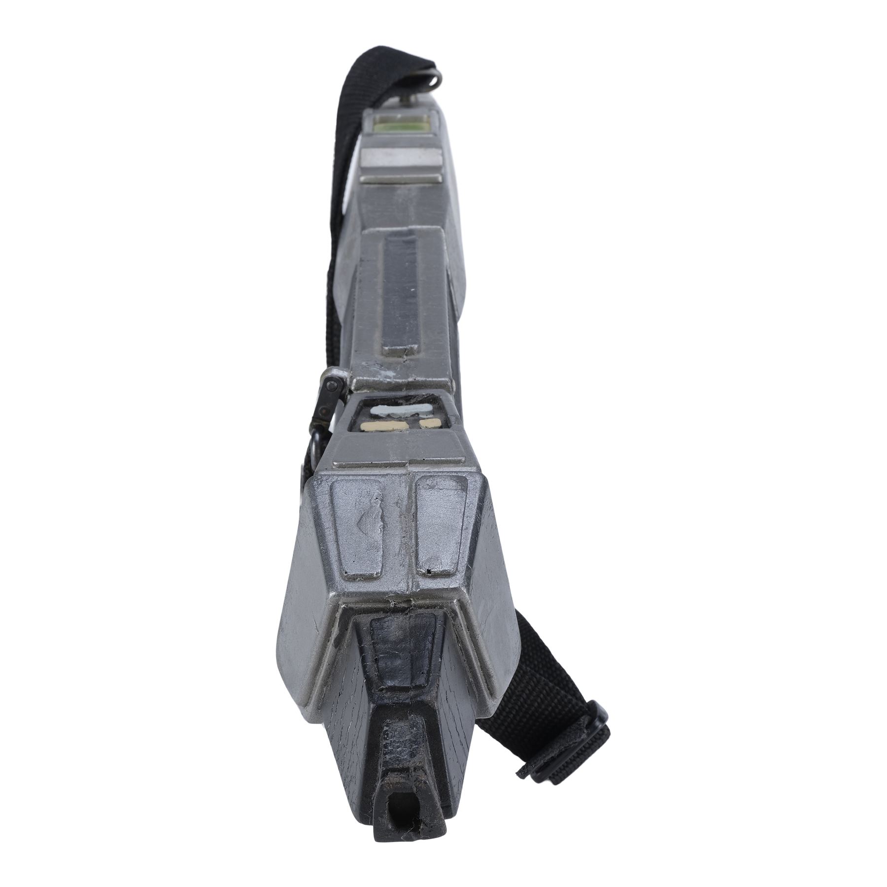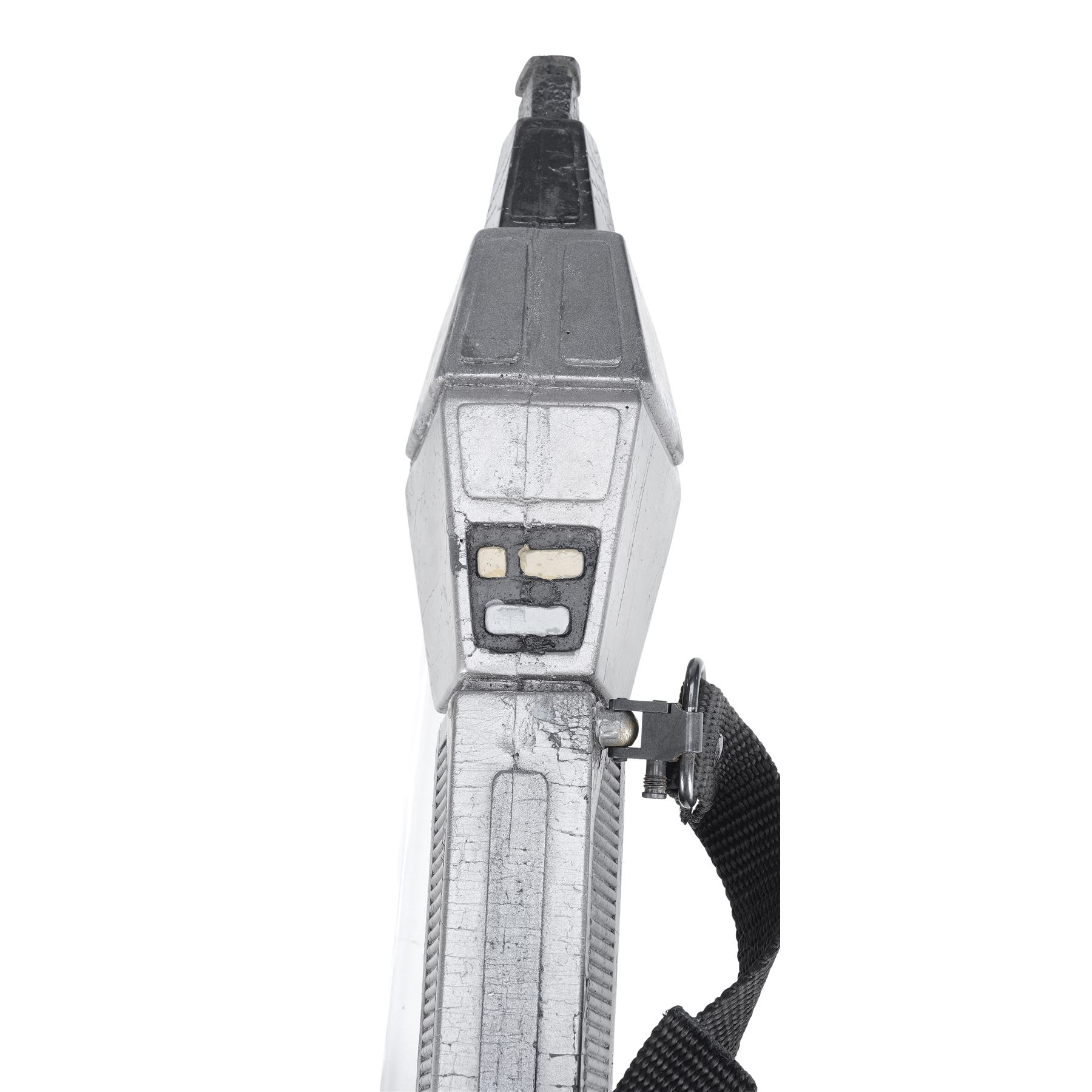 This rubber phaser rifle is painted black and gray with static buttons and two ribbed grips, and a black webbed nylon shoulder strap. This rifle exhibits cracking and pitting in the rubber, as well as a buildup of grime and flaked paint. Dimensions: 25" x 6" x 4" (63.5 cm x 15.25 cm x 10.25 cm)