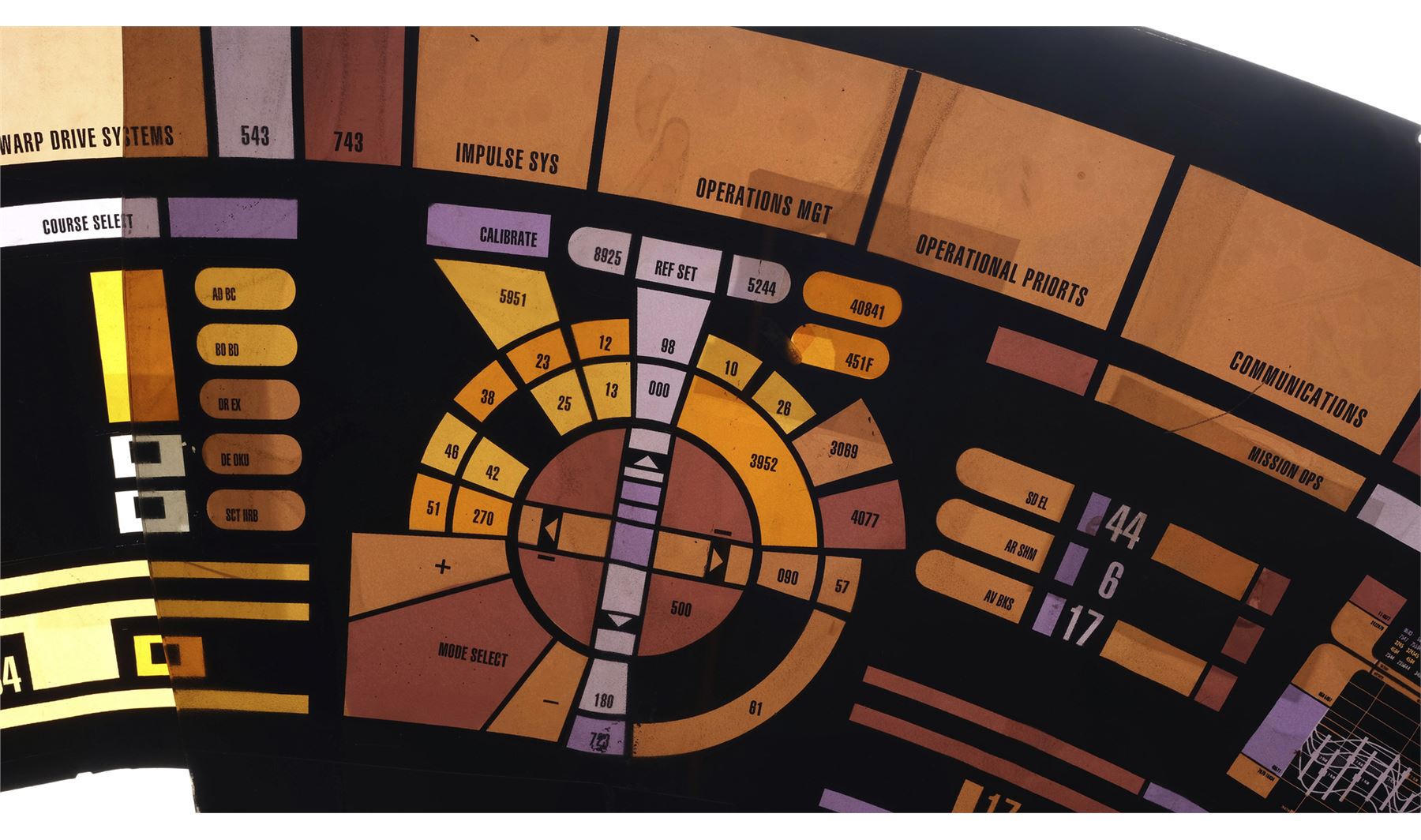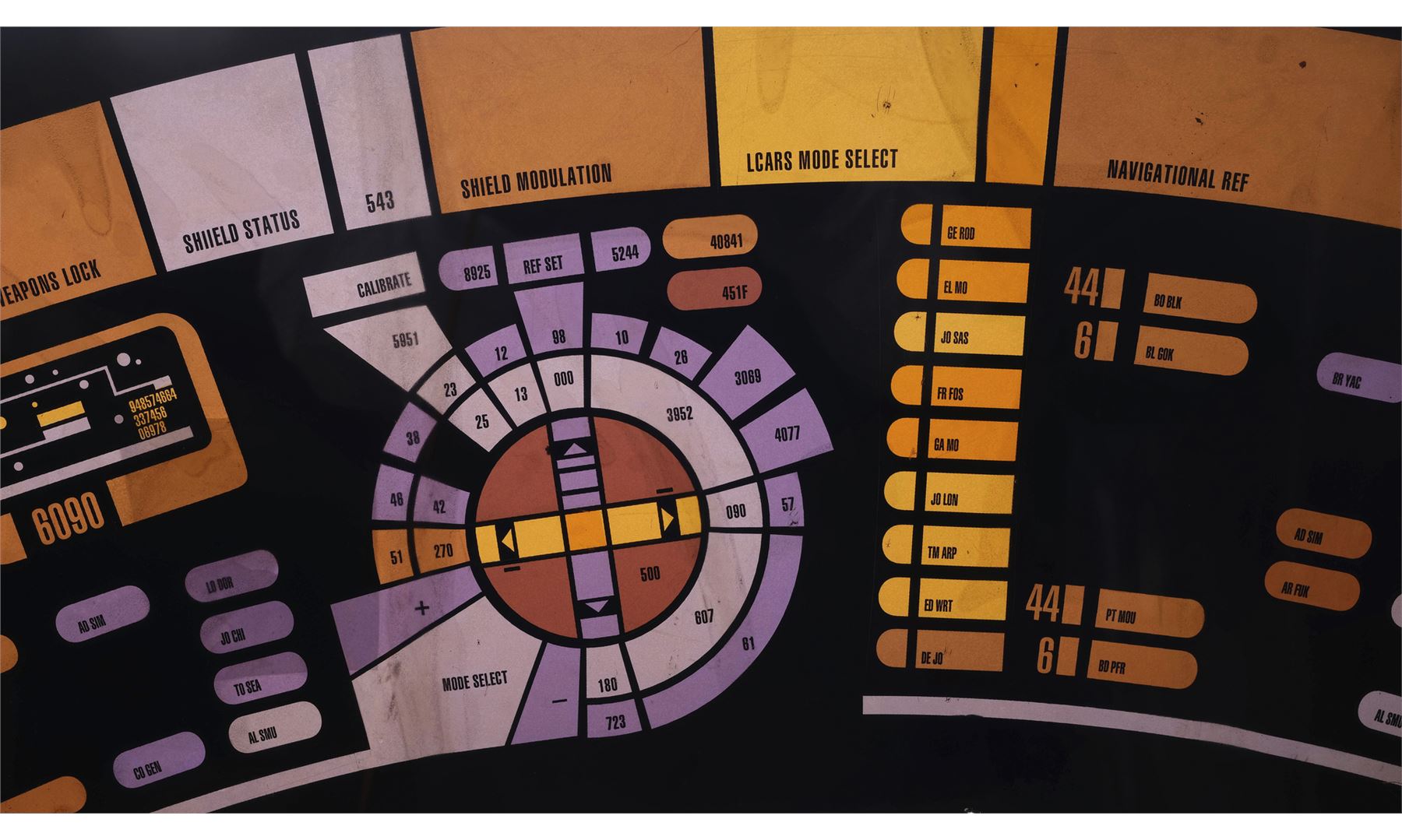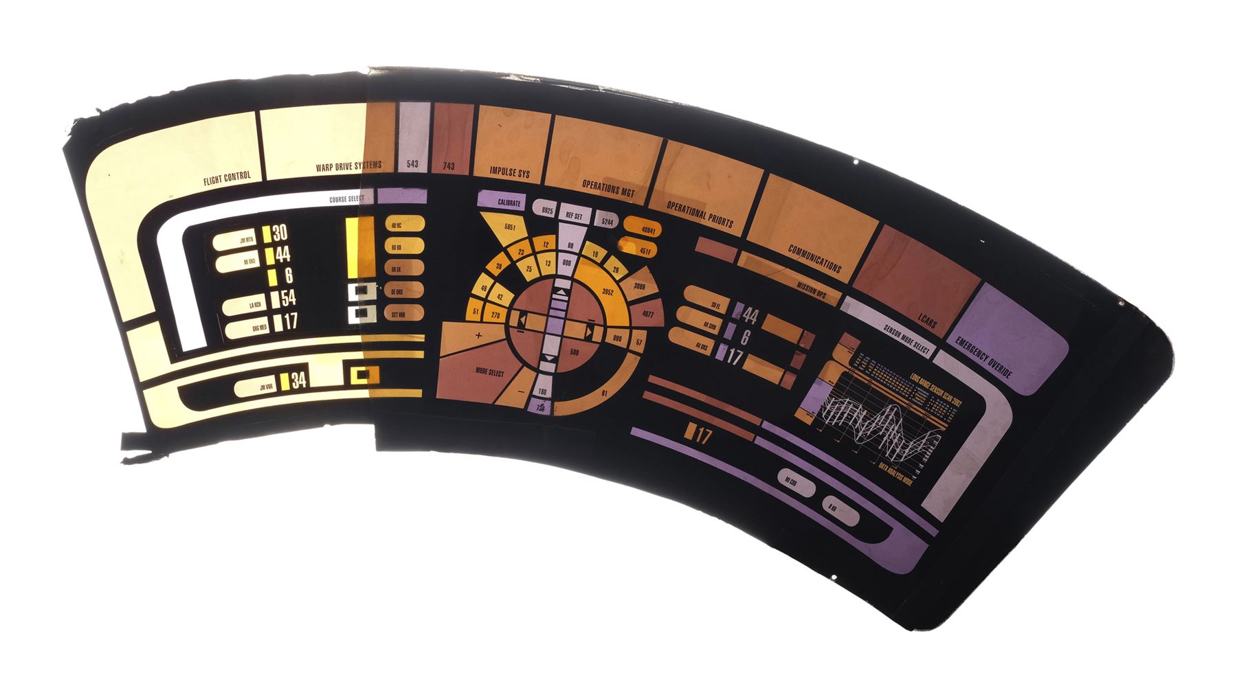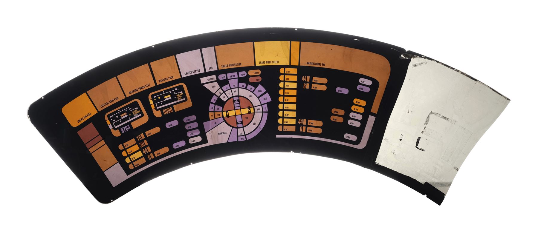 STAR TREK: DEEP SPACE NINE (T.V. SERIES, 1994-1999) - USS Defiant Helm Console LCARS Panel - A USS Defiant helm console LCARS panel from the television series Star Trek: Deep Space Nine. The condensed helm console on the bridge of the Defiant used a LCARS interface to allow a single operator, often Jadzia Dax (Terry Farrell), access to multiple systems including conn and ops.