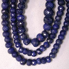 GRADUATED COLOR ENHANCED BLUE SAPPHIRE STRAND. IN WEIGHTS 366 CTS AND EACH BEAD MEASURES BETWEEN 5 AND 9 MM. INCLUSIONS VISIBLE. TEMPORARY METAL CLASP. LENGTH OF THE STRAND: 24 INCHES