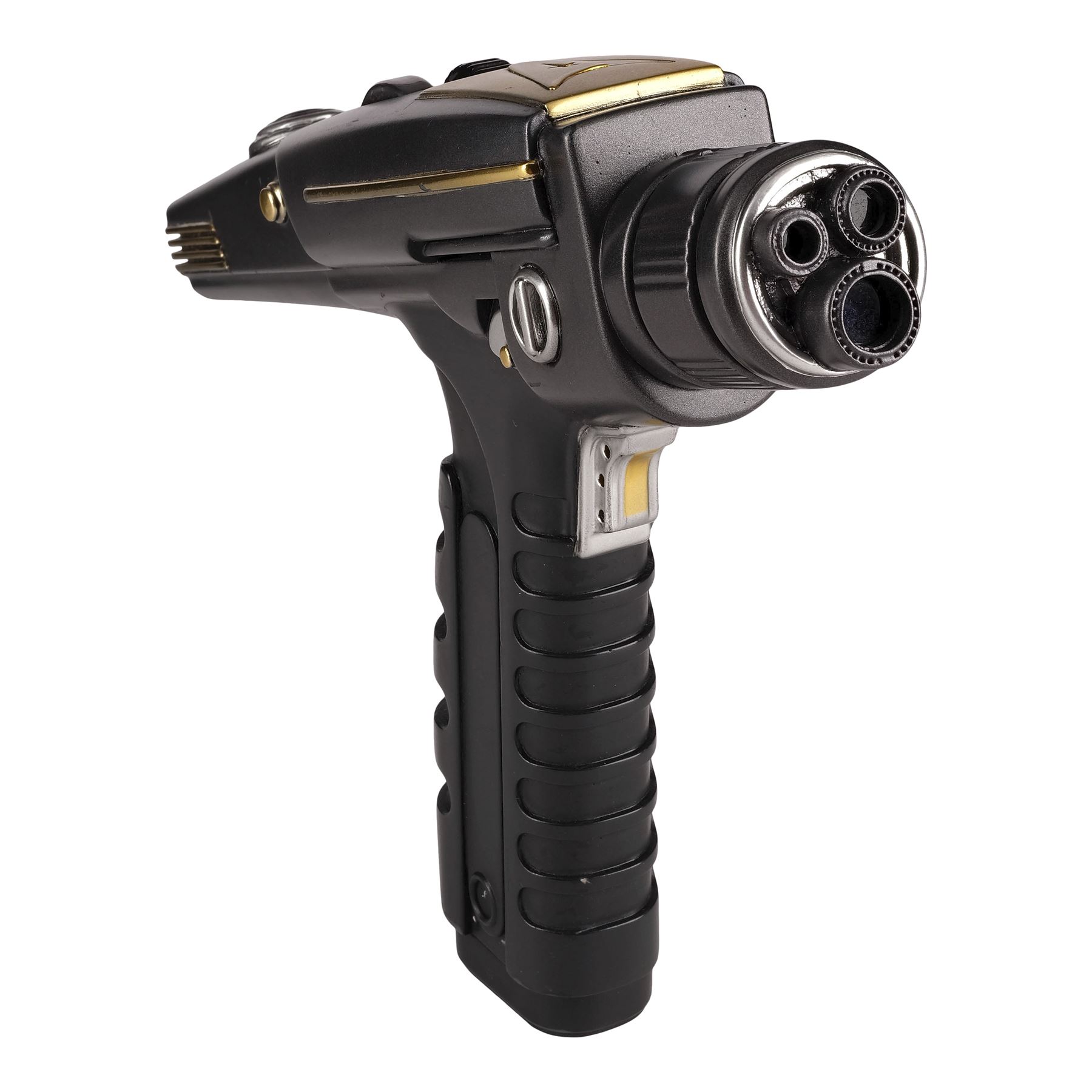 This detailed phaser's resin body is painted black and gold-color with cast details including non-functional buttons and dials, a stationary trigger, a three-emitter front, and an embedded Type I phaser with a Starfleet delta on it. A small circular indicator on the rear of the phaser illuminates blue (stun) or red (kill) via a button on the base of its ridged grip. The phaser exhibits scuffing around the button and other parts of the grip, as well as minor exposure to the resin from paint chipping. Dimensions: 10" x 7" x 2.5" (25.5 cm x 18 cm x 6.5 cm)
