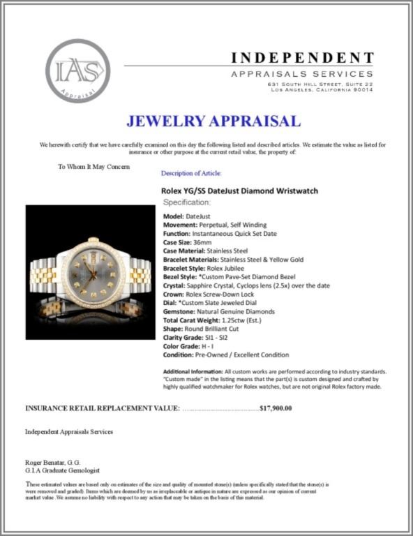 Regarding Appraised Jewelry and Loose Stones - Auctionfarm sends them out to a third party for Retail Replacement Value Appraisals, which are the most common. These types of evaluations are written for insurance needs. This would be the cost to replace the jewelry with an item of equal quality and kind, considered to be the current market price or the replacement value. This type of appraisal is done to protect you in the event of damage or loss of a valuable item. Our appraisals are conducted by independent 3rd Party appraisal firms that utilizes Certified GIA Gemologist. Appraisals should be used for verification of gemstone and/or metal weight, size, and grade only, not actual value. Appraisal value should be considered for insurance purposes only, not actual value, as price varies greatly from retail locations thru out the world. Items should not be purchased with the expectation to resell for appraisal price, or for profit.