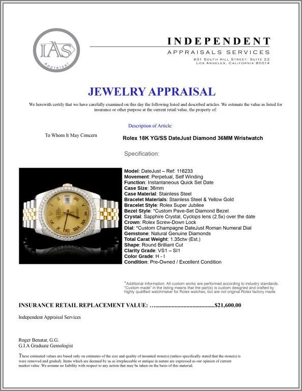 Regarding Appraised Jewelry and Loose Stones - Auctionfarm sends them out to a third party for Retail Replacement Value Appraisals, which are the most common. These types of evaluations are written for insurance needs. This would be the cost to replace the jewelry with an item of equal quality and kind, considered to be the current market price or the replacement value. This type of appraisal is done to protect you in the event of damage or loss of a valuable item. Our appraisals are conducted by independent 3rd Party appraisal firms that utilizes Certified GIA Gemologist. Appraisals should be used for verification of gemstone and/or metal weight, size, and grade only, not actual value. Appraisal value should be considered for insurance purposes only, not actual value, as price varies greatly from retail locations thru out the world. Items should not be purchased with the expectation to resell for appraisal price, or for profit.