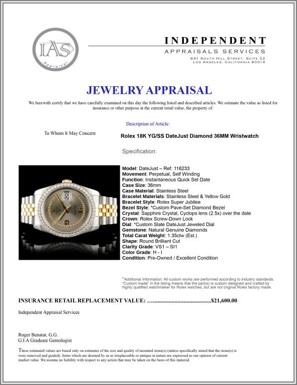 Regarding Appraised Jewelry and Loose Stones - Auctionfarm sends them out to a third party for Retail Replacement Value Appraisals, which are the most common. These types of evaluations are written for insurance needs. This would be the cost to replace the jewelry with an item of equal quality and kind, considered to be the current market price or the replacement value. This type of appraisal is done to protect you in the event of damage or loss of a valuable item. Our appraisals are conducted by independent 3rd Party appraisal firms that utilizes Certified GIA Gemologist. Appraisals should be used for verification of gemstone and/or metal weight, size, and grade only, not actual value. Appraisal value should be considered for insurance purposes only, not actual value, as price varies greatly from retail locations thru out the world. Items should not be purchased with the expectation to resell for appraisal price, or for profit.