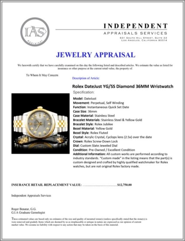 Estimated Retail Replacement Value: $12,750.00Ref: BAS15000Item No.: ARXAA-0004Specification:Documents: Appraisal ReportModel: DateJustMovement: Perpetual, Self WindingFunction: Instantaneous Quick Set DateCase Size: 36mmCase Material: Stainless Steel Bracelet Materials: Stainless Steel & Yellow GoldBracelet Style: Rolex JubileeBezel Material: Yellow GoldBezel Style: Rolex FlutedCrystal: Acrylic Crystal, Cyclops lens (2.5x) over the dateCrown: Rolex Screw-Down LockDial: Custom Slate Jeweled Dial Condition: Pre-Owned / Excellent Condition*Additional Information: All custom works are performed according to industry standards. ÒCustom madeÓ in the listing means that the part(s) is custom designed and crafted by highly qualified watchmaker for Rolex watches, but are not original Rolex factory made. Great Condition - Shipping notes: We ship 4-10 Business day after the clearance of payment. Tracking numbers are emailed once the package(s) are shipped. Most shipments are sent by FEDEX Priority, UPS Priority, or US PRIORITY MAIL INSURED