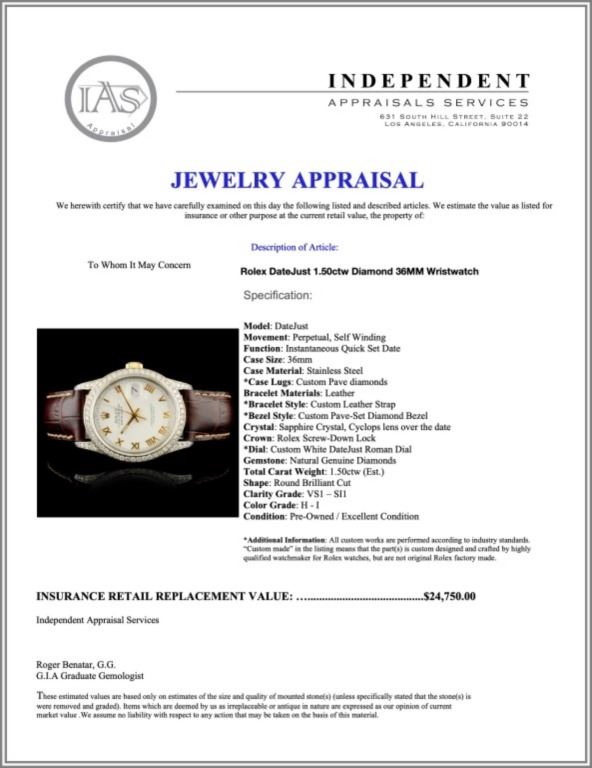 Regarding Appraised Jewelry and Loose Stones - Auctionfarm sends them out to a third party for Retail Replacement Value Appraisals, which are the most common. These types of evaluations are written for insurance needs. This would be the cost to replace the jewelry with an item of equal quality and kind, considered to be the current market price or the replacement value. This type of appraisal is done to protect you in the event of damage or loss of a valuable item. Our appraisals are conducted by independent 3rd Party appraisal firms that utilizes Certified GIA Gemologist. Appraisals should be used for verification of gemstone and/or metal weight, size, and grade only, not actual value. Appraisal value should be considered for insurance purposes only, not actual value, as price varies greatly from retail locations thru out the world. Items should not be purchased with the expectation to resell for appraisal price, or for profit.