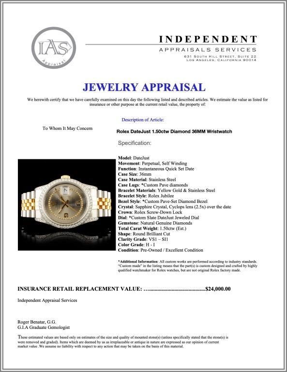 Regarding Appraised Jewelry and Loose Stones - Auctionfarm sends them out to a third party for Retail Replacement Value Appraisals, which are the most common. These types of evaluations are written for insurance needs. This would be the cost to replace the jewelry with an item of equal quality and kind, considered to be the current market price or the replacement value. This type of appraisal is done to protect you in the event of damage or loss of a valuable item. Our appraisals are conducted by independent 3rd Party appraisal firms that utilizes Certified GIA Gemologist. Appraisals should be used for verification of gemstone and/or metal weight, size, and grade only, not actual value. Appraisal value should be considered for insurance purposes only, not actual value, as price varies greatly from retail locations thru out the world. Items should not be purchased with the expectation to resell for appraisal price, or for profit.