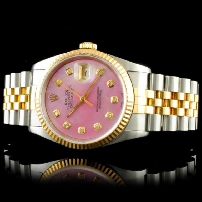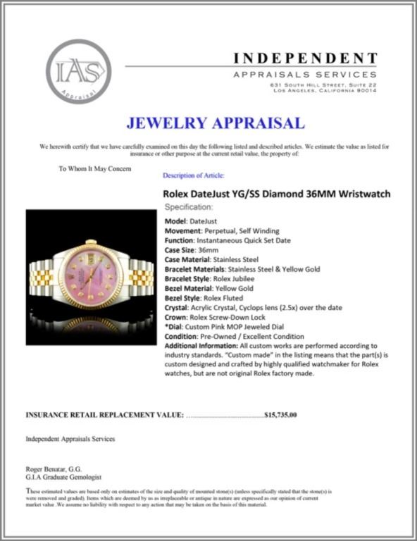 Estimated Retail Replacement Value: $15,735.00Ref: WAG15000Item No.: ARXAA-0027Specification:Documents: Appraisal ReportModel: DateJustMovement: Perpetual, Self WindingFunction: Instantaneous Quick Set DateCase Size: 36mmCase Material: Stainless Steel Bracelet Materials: Stainless Steel & Yellow Gold Bracelet Style: Rolex JubileeBezel Material: Yellow GoldBezel Style: Rolex FlutedCrystal: Acrylic Crystal, Cyclops lens (2.5x) over the dateCrown: Rolex Screw-Down Lock*Dial: Custom Pink MOP Jeweled Dial Condition: Pre-Owned / Excellent Condition*Additional Information: All custom works are performed according to industry standards. ÒCustom madeÓ in the listing means that the part(s) is custom designed and crafted by highly qualified watchmaker for Rolex watches, but are not original Rolex factory made. Great Condition - Shipping notes: We ship 4-10 Business day after the clearance of payment. Tracking numbers are emailed once the package(s) are shipped. Most shipments are sent by FEDEX Priority, UPS Priority, or US PRIORITY MAIL INSURED