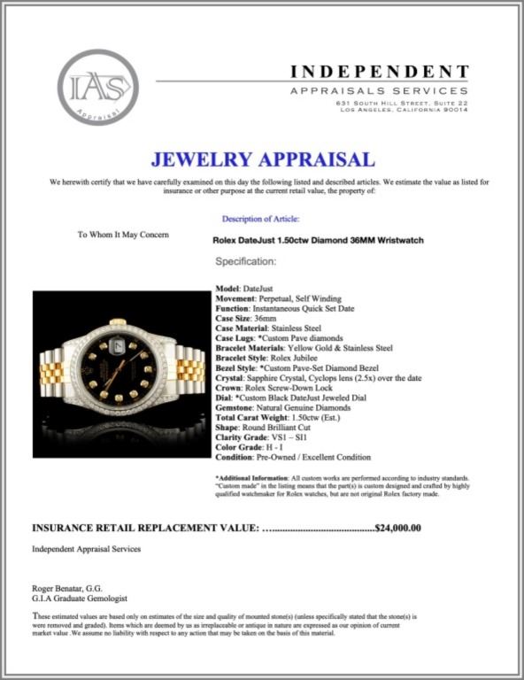 Regarding Appraised Jewelry and Loose Stones - Auctionfarm sends them out to a third party for Retail Replacement Value Appraisals, which are the most common. These types of evaluations are written for insurance needs. This would be the cost to replace the jewelry with an item of equal quality and kind, considered to be the current market price or the replacement value. This type of appraisal is done to protect you in the event of damage or loss of a valuable item. Our appraisals are conducted by independent 3rd Party appraisal firms that utilizes Certified GIA Gemologist. Appraisals should be used for verification of gemstone and/or metal weight, size, and grade only, not actual value. Appraisal value should be considered for insurance purposes only, not actual value, as price varies greatly from retail locations thru out the world. Items should not be purchased with the expectation to resell for appraisal price, or for profit.