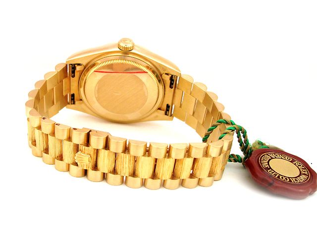 36mm Rolex 18K Yellow Gold Oyster Perpetual Daydate Watch. Champagne Dial. 18K Yellow Gold Bark Finish Bezel. 18K Yellow Gold Bark-Finish Band