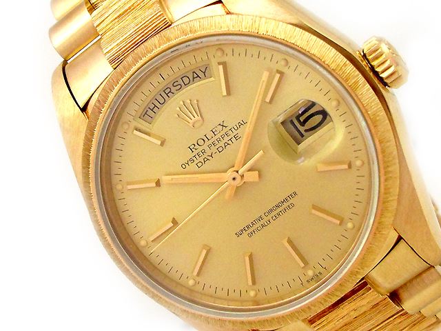 36mm Rolex 18K Yellow Gold Oyster Perpetual Daydate Watch. Champagne Dial. 18K Yellow Gold Bark Finish Bezel. 18K Yellow Gold Bark-Finish Band